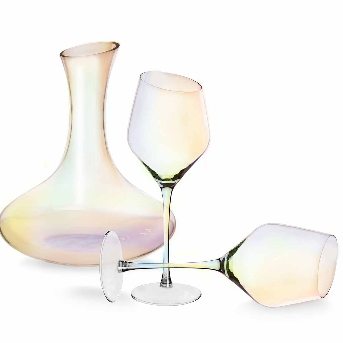 Když toho máte za celý den dost nebo si chcete jen užít příjemné chvíle s partnerem či přáteli, sáhněte po designových skleničkách na víno o objemu 0,47 l a 2litrové karafě, z nichž si svou oblíbenou odrůdu opravdu vychutnáte. Navíc budete okouzleni efektem luxusně vypadajícího duhového skla.