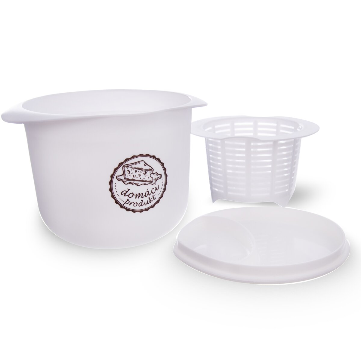 Kód produktu 142574Nádoba na výrobu sýrů, tvarohu i domácí lučiny s vloženým cedníkem k odkapávání syrovátky.