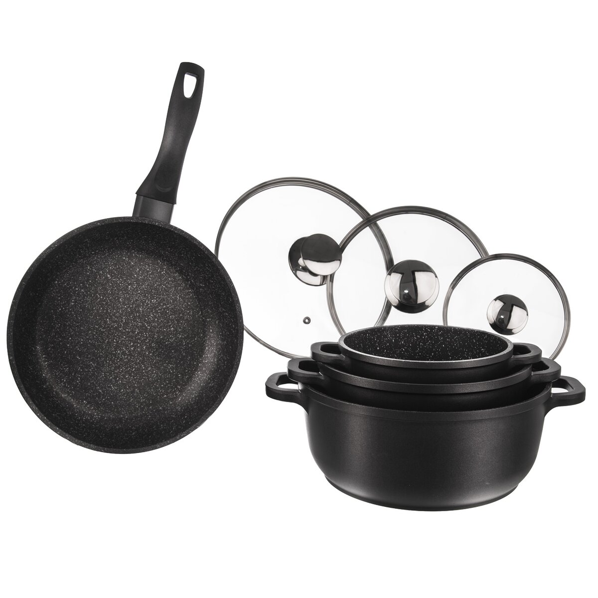 Kód produktu 113380Sada tří hrnců GRANDE se skleněnou poklicí a pánví s kvalitním nepřilnavým povrchem je vhodný na všechny typy sporáků včetně indukce, hrnce i do trouby. Jako DÁREK je k sadě i praktický stojan na nože s 5 kusy kuchyňských nožů.