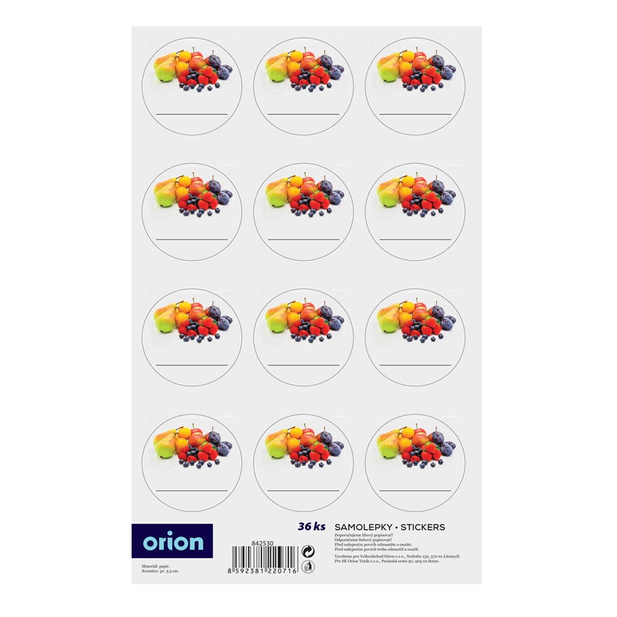Kód produktu 842530Sada 36 kusů univerzálních papírových samolepek je doplněna motivem ovoce a prostorem pro označení druhu kompotu, džemu či sirupu, případně roku jeho výroby. Průměr jedné kulaté samolepky je 3,5 cm.