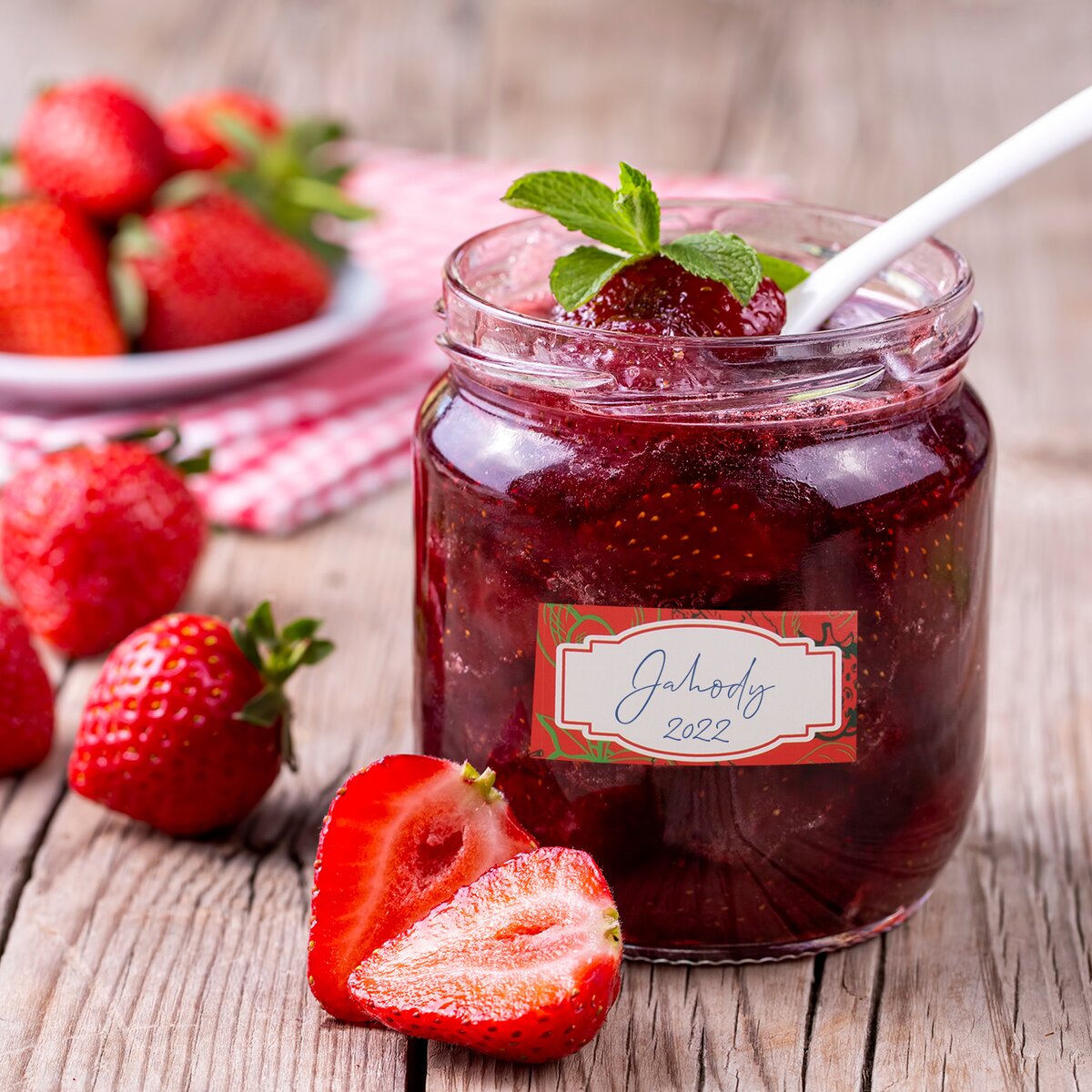 Kód produktu 842248Sada 12 kusů prázdných červených samolepek ŠPAJZ na dózy s potravinami.