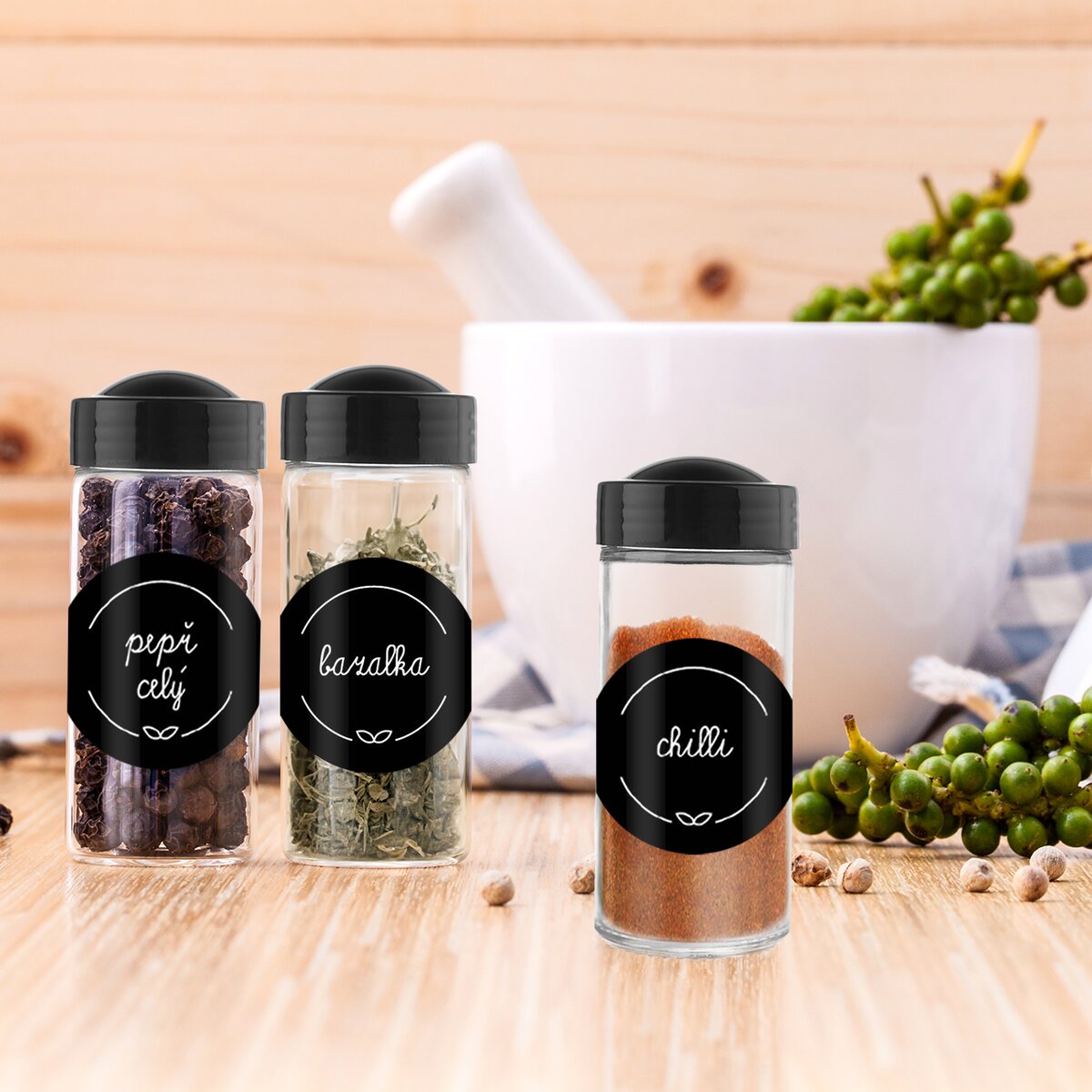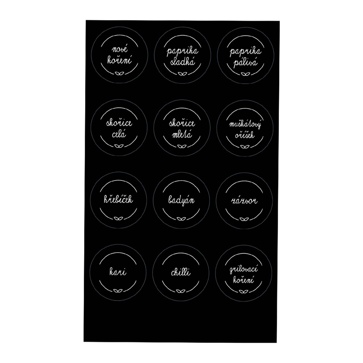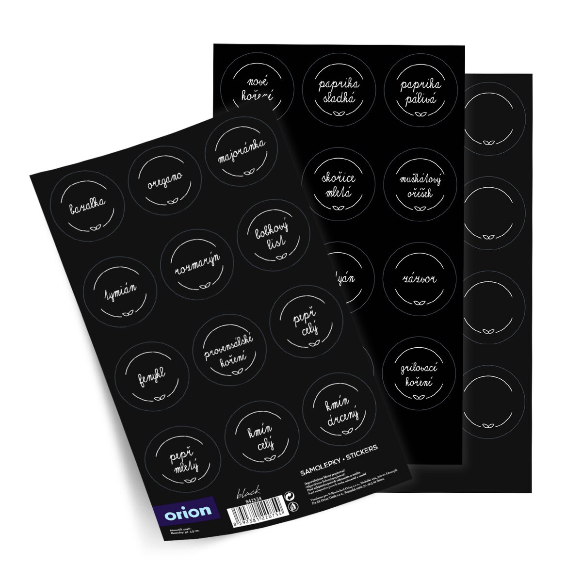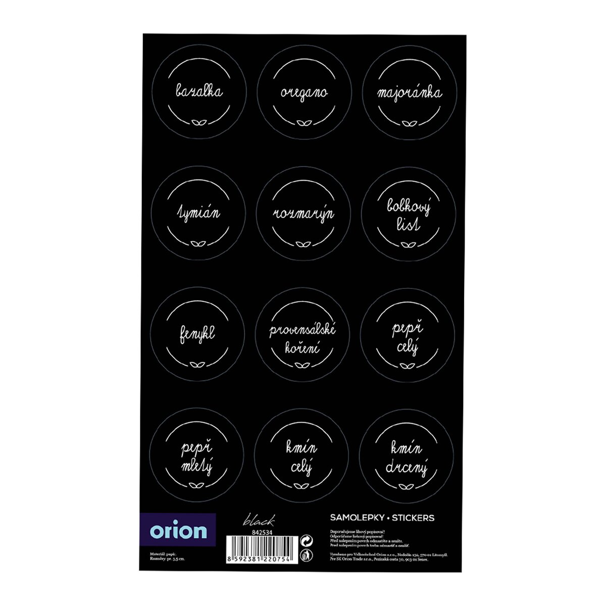 V balení jsou 3 archy (celkem 36 samolepek) s nejpoužívanějšími surovinami, najdete zde např. pepř, majoránku, kmín, grilovací koření a další druhy voňavého koření. Hodí se např. k označení plastových, plechových dóz nebo kořenek Black.