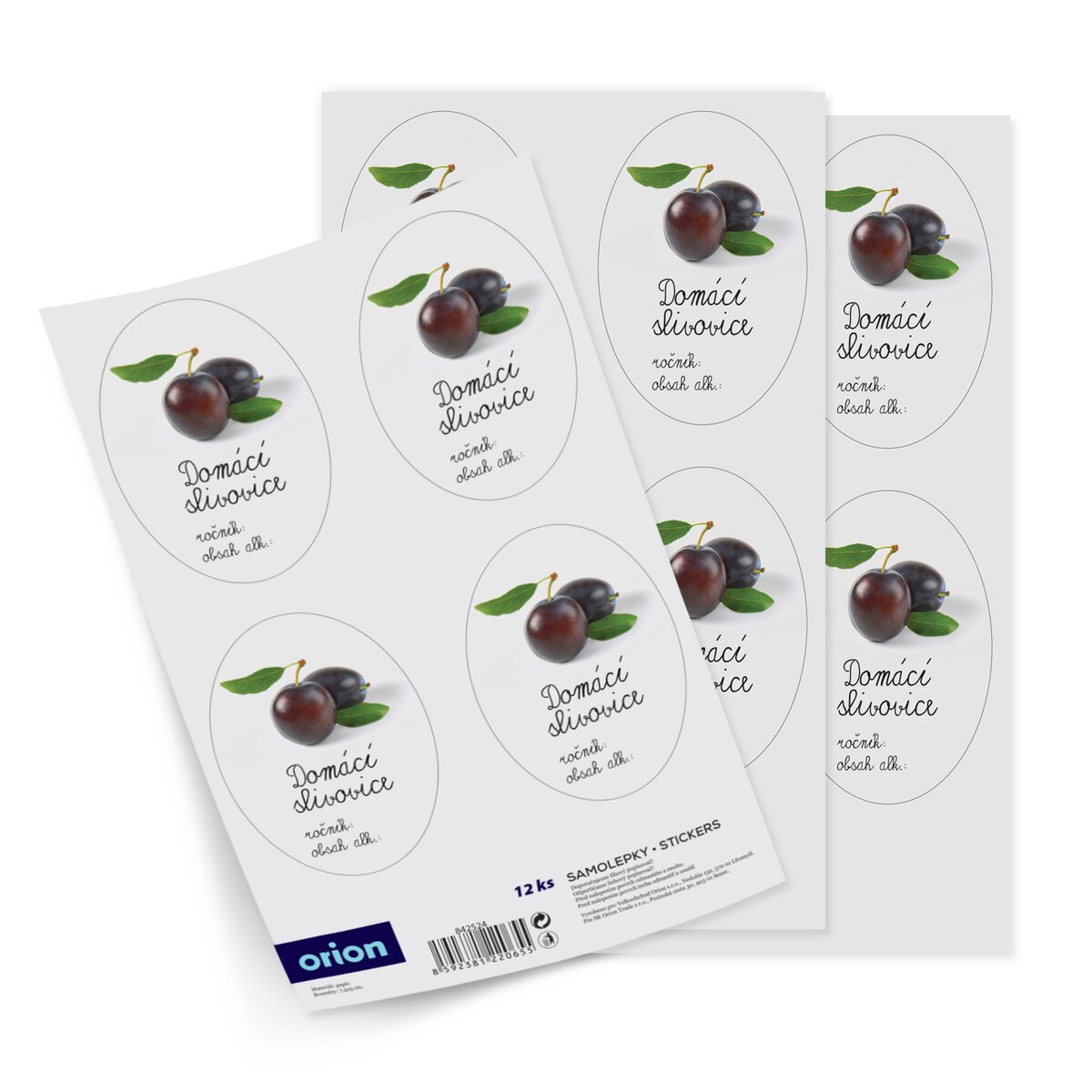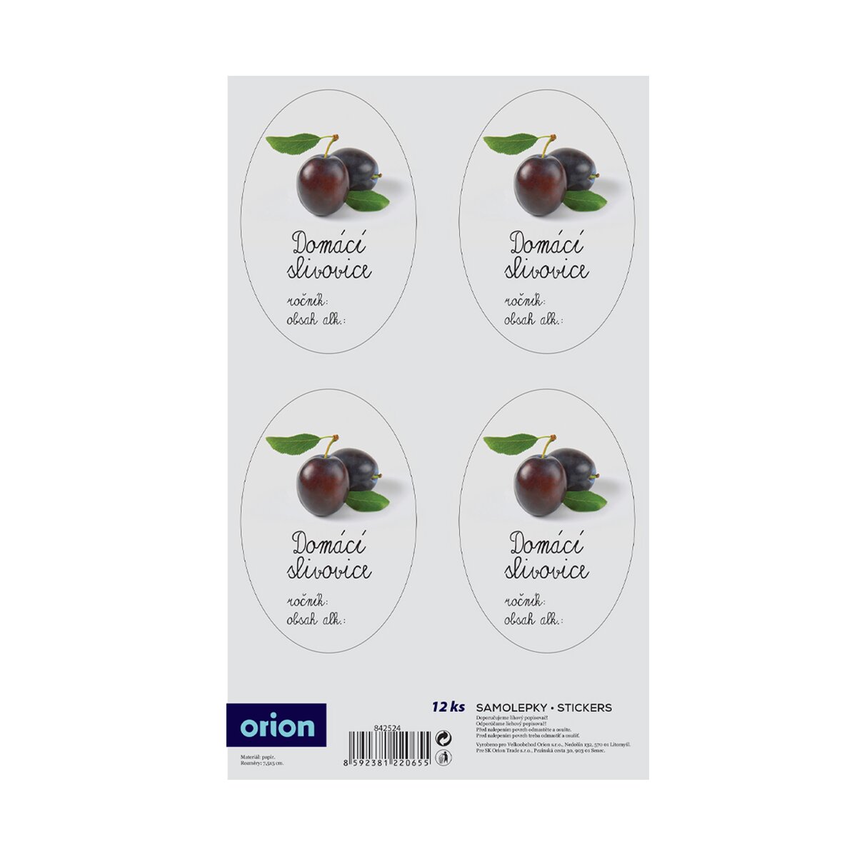 Kód produktu 842524Sada 12 kusů papírových samolepek s obrázkem a popisem DOMÁCÍ SLIVOVICE. Rozměr jedné oválné samolepky je 5x7,5 cm.