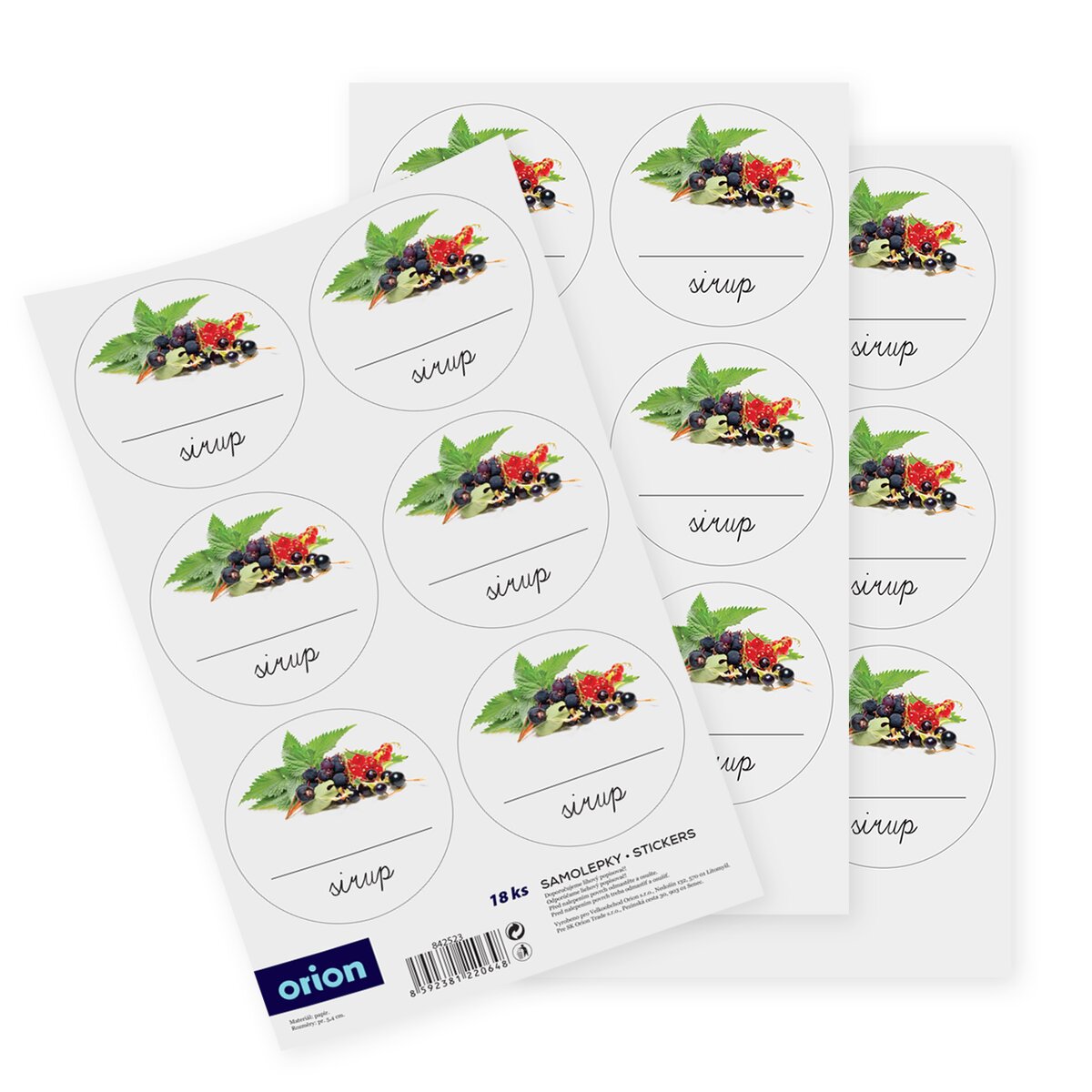 Kód produktu 842523Sada 18 kusů univerzálních papírových samolepek je doplněna obrázkem a prostorem pro označení druhu sirupu nebo roku jeho výroby. Průměr jedné kulaté samolepky je 5,4 cm.