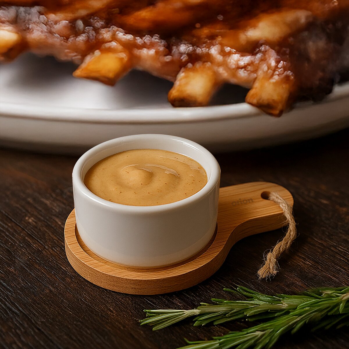 Kód produktu 127809Stylová miska s bambusovým táckem na servírování omáček, dipů a drobných pochoutek.