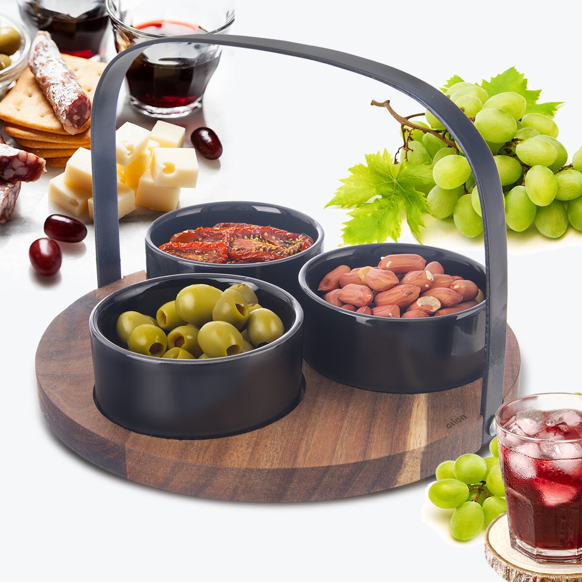 Více informacíČerné servírovací misky z keramiky jsou uloženy na tácku z akáciového dřeva s krásnou kresbou, takže můžete mít své oblíbené krekry, směs ořechů, olivy, kostičky sýra nebo sušené ovoce pěkně pohromadě. Hodí se i k podávání dipů ke grilovaným dobrotám nebo pomazánek typu guacamole. Díky kovovému držadlu vše snadno přenesete.