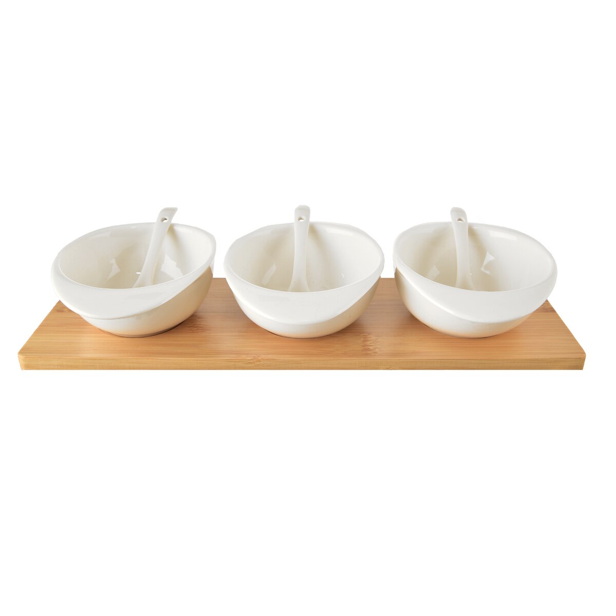 Kód produktu 129900Servírovací set 3 oválných porcelánových misek, umístěných na bambusovém tácu, je určen k podávání drobných pochutin, ořechů, sýrů, oliv, krekrů apod. Pohodlné nabírání zajistí 3 bílé porcelánové lžičky.