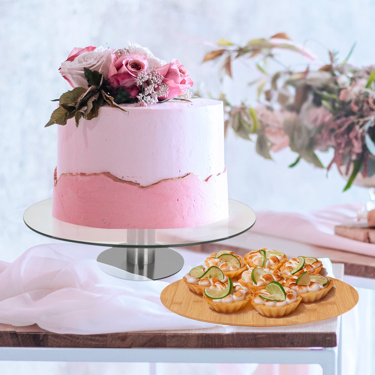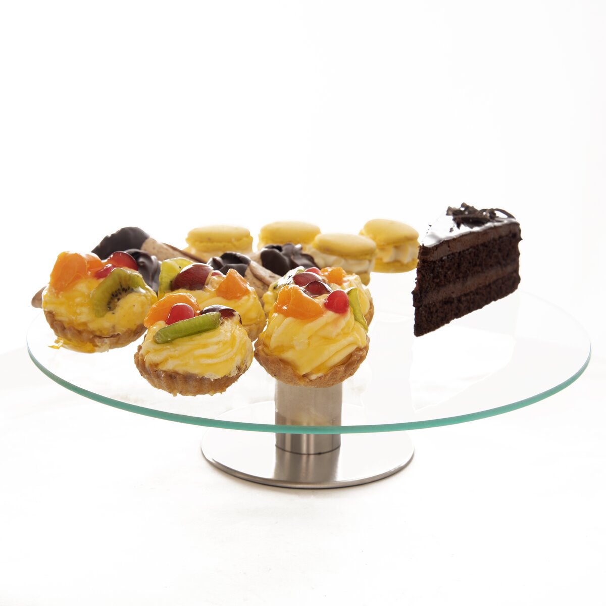 Kód produktu 122978Otočný skleněný stojan průměru 30 cm s nerezovým podstavcem pomůže stylově servírovat pizzu, zákusky i chlebíčky, pomůže s potahováním dortů a jejich zdobením.