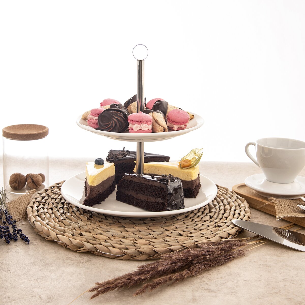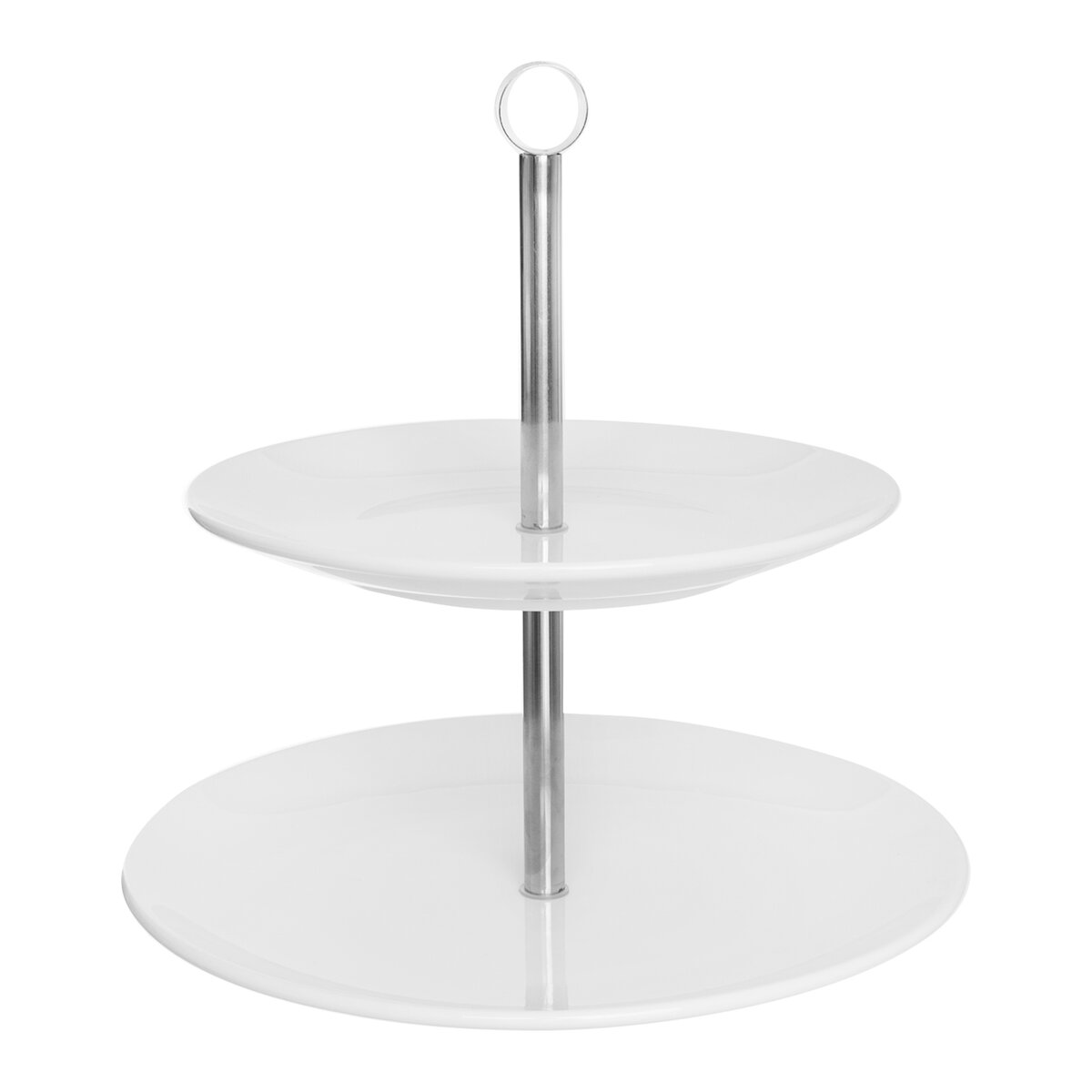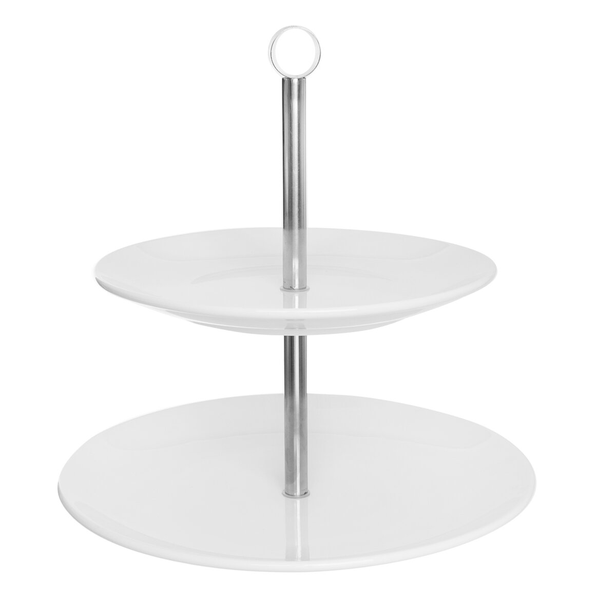Kód produktu 122963Dvoupatrový stojan určený k servírování dezertů a slaných pochutin. Součástí jsou kulaté porcelánové talíře, jejichž průměr je 20,5 cm a 25,5 cm.