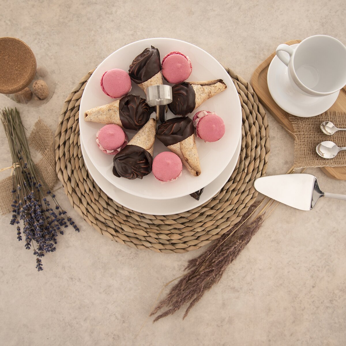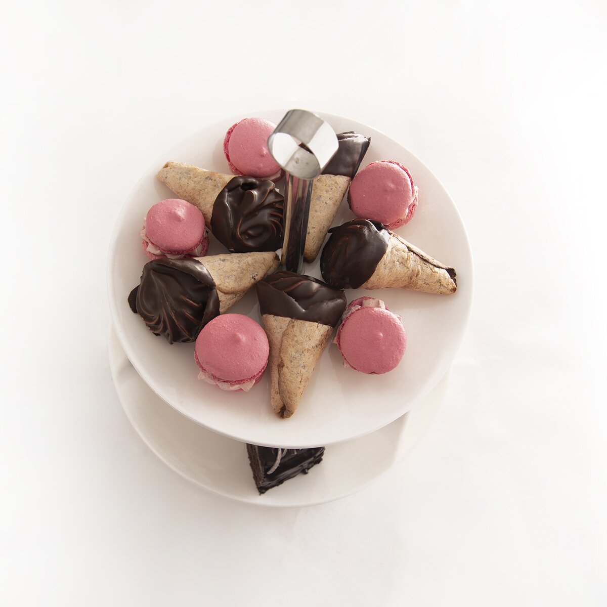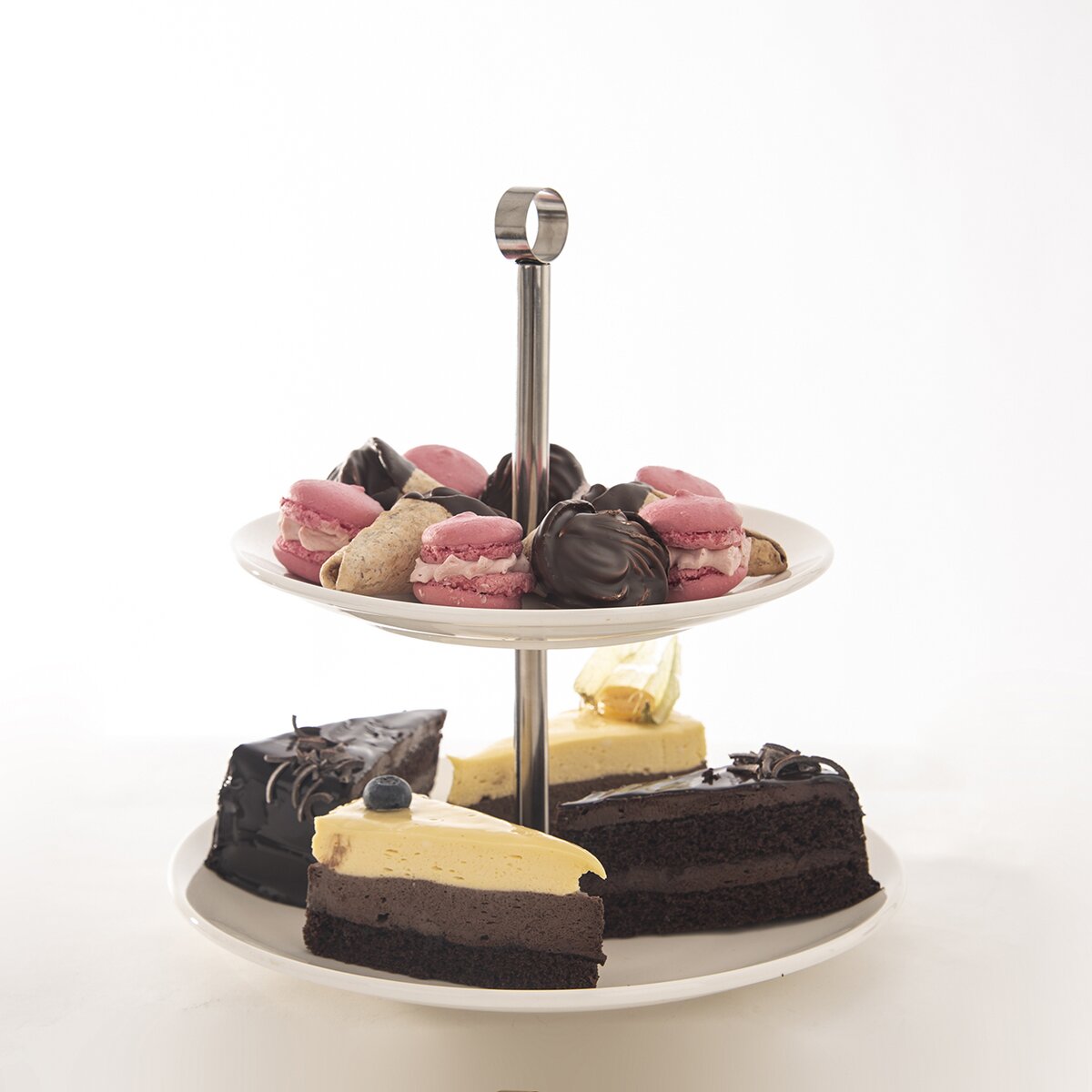 Kód produktu 122963Dvoupatrový stojan určený k servírování dezertů a slaných pochutin. Součástí jsou kulaté porcelánové talíře, jejichž průměr je 20,5 cm a 25,5 cm.