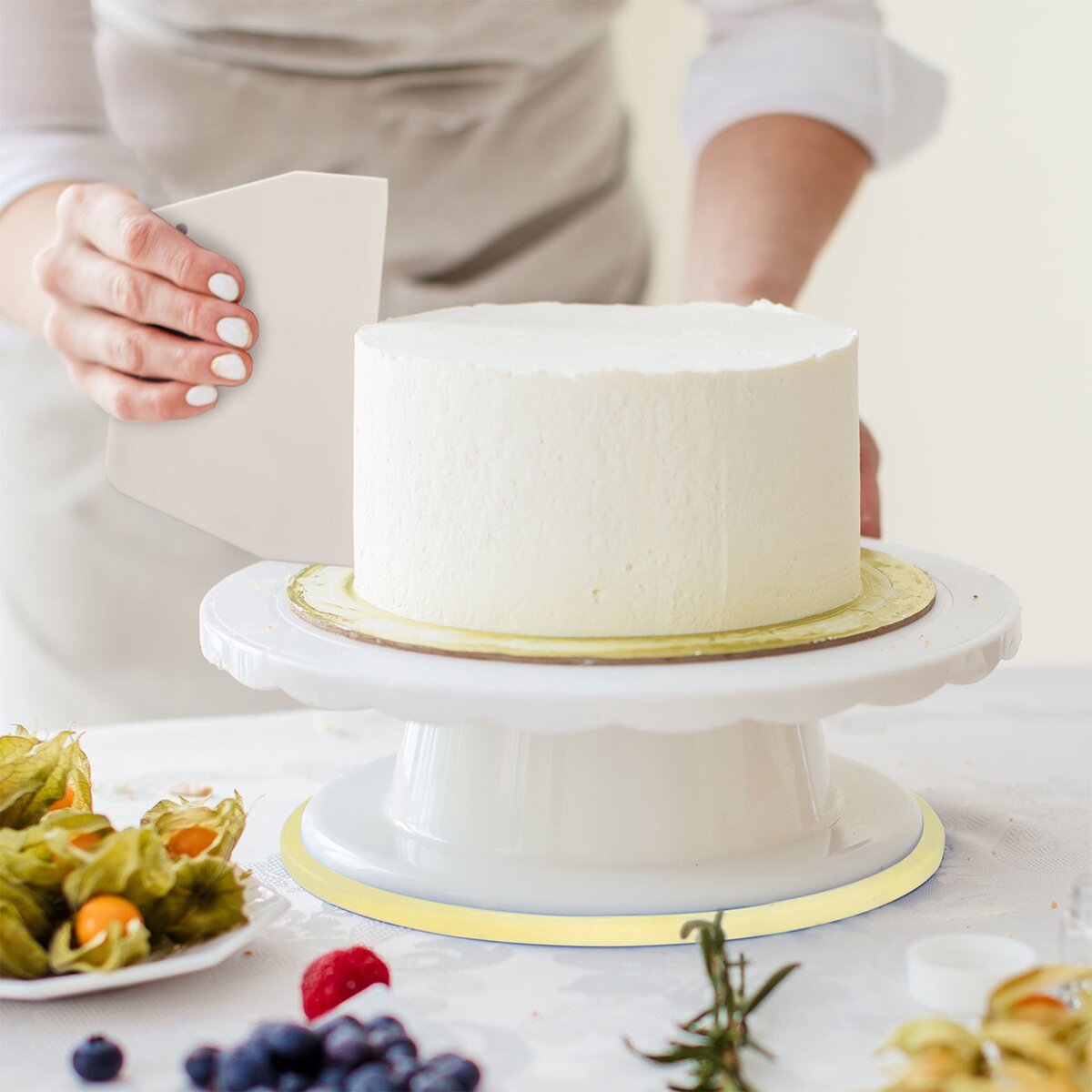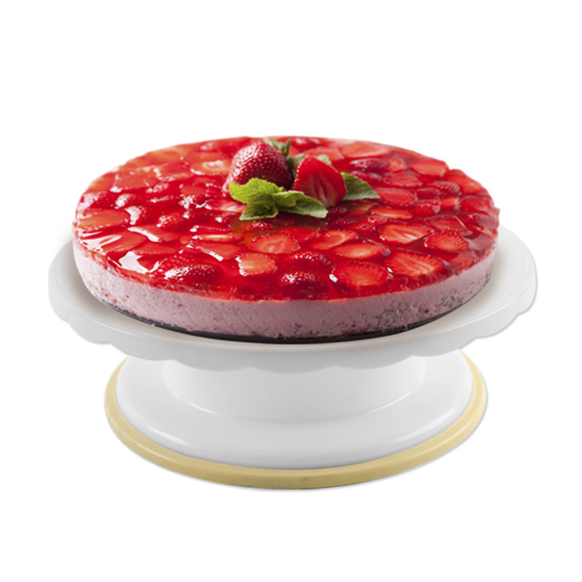 Během vyhlazování potahovací hmoty, přípravy nahých dortů i jejich zdobení je možné s tácem otáčet, díky čemuž bude zdobení snadnější. Vzhledem k tomu, že se jedná nejen o velmi praktický, ale i stylový kousek, můžete na něm váš dezert rovnou servírovat.