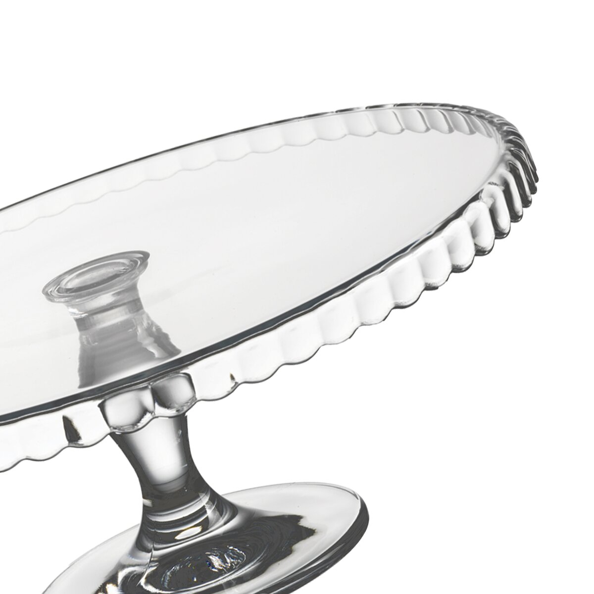 Krásný skleněný podnos na nožce, který můžete využít k servírování koláče, dortu, bábovky nebo jiných dezertů. Na stole upoutá pozornost především jeho ozdobný vroubkovaný okraj zahnutý dolů, takže i jednotlivé řezy koláče, dortu snadno naberete lopatkou nebo nožem.