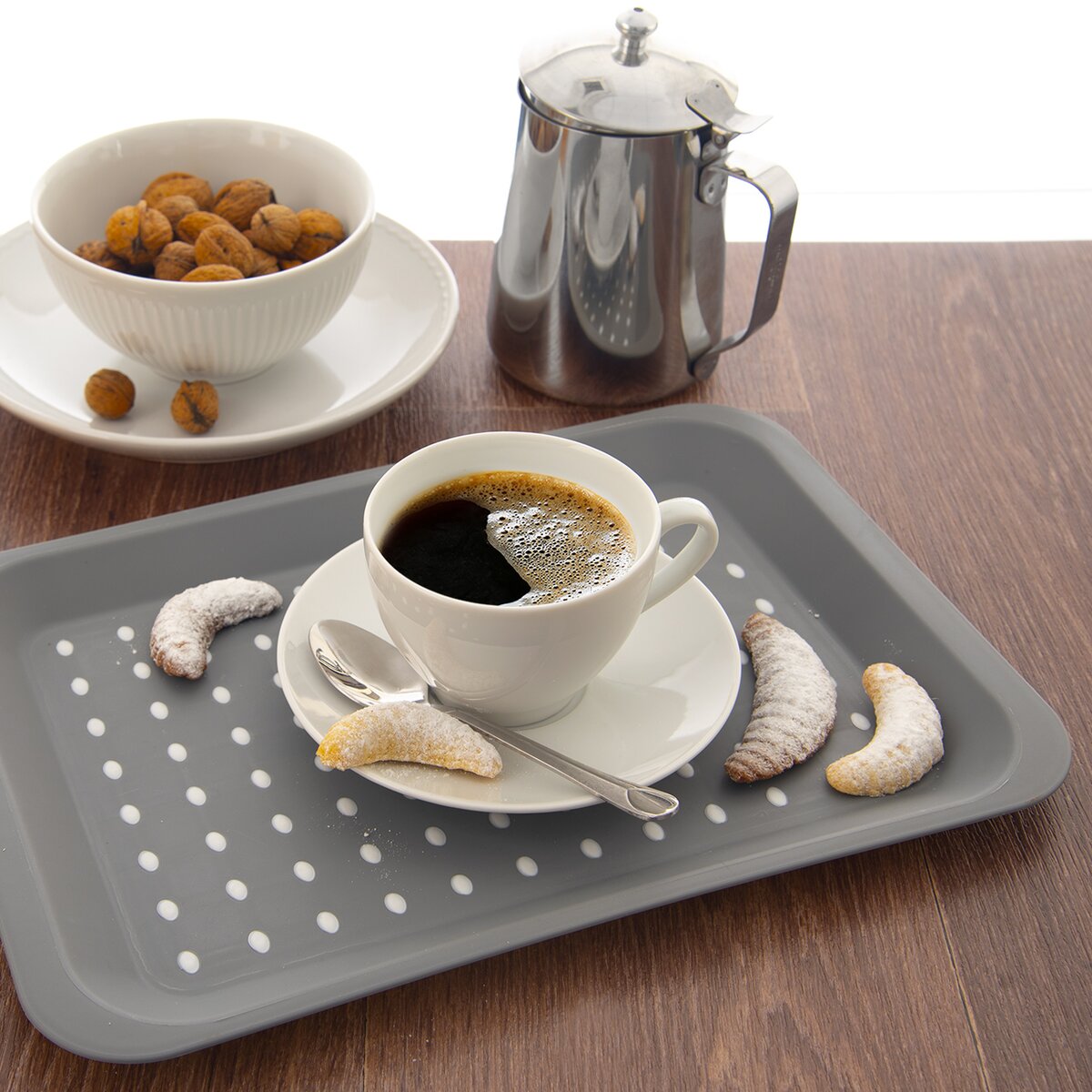 Plastový tác v šedé barvě se stane neocenitelným pomocníkem při servírování občerstvení. Ve spodní části se nachází gumová podložka, díky které se tác neklouže. Výborně se hodí k podávání snídaně, svačiny nebo kávy s dezertem.