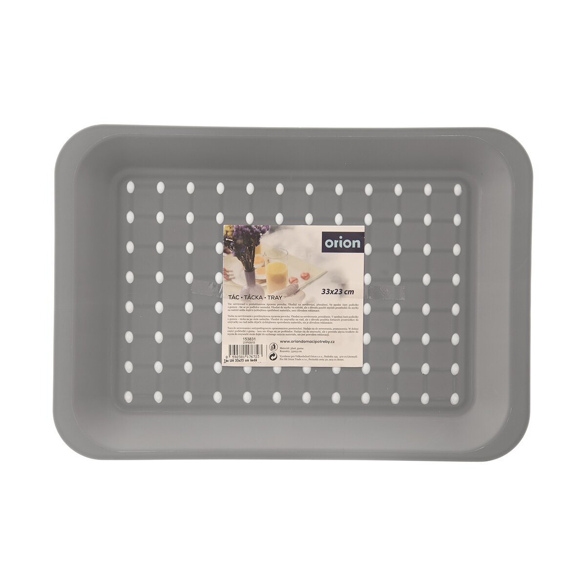 Kód produktu 153831Šedý plastový servírovací tác obdélníkového tvaru, o rozměrech 33×23 cm, s protiskluzovou úpravou povrchu.