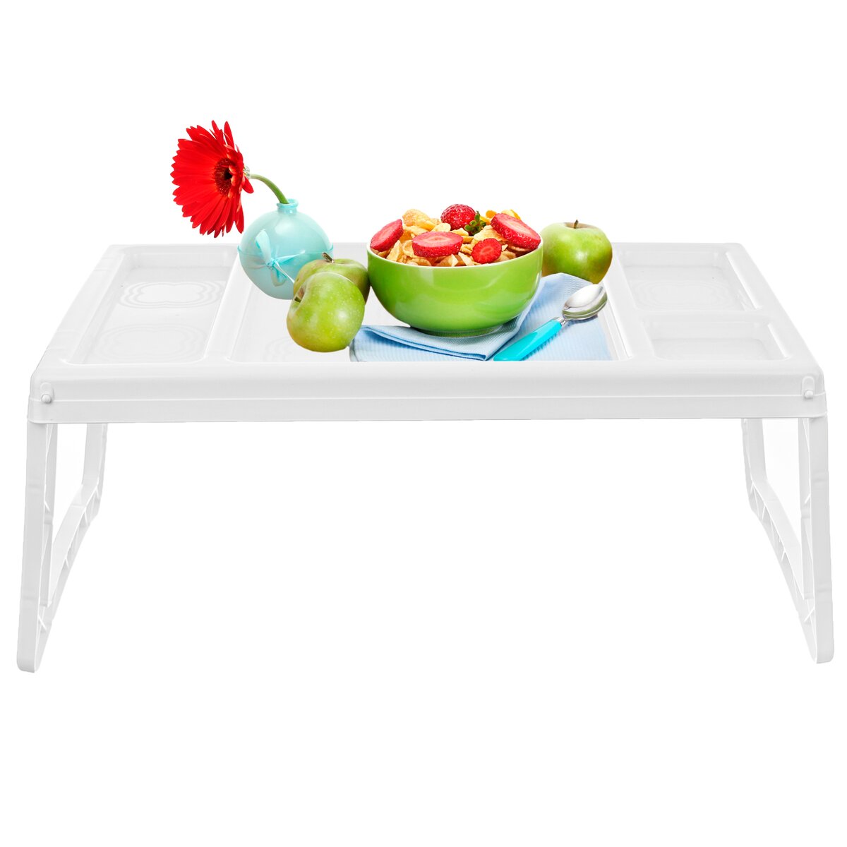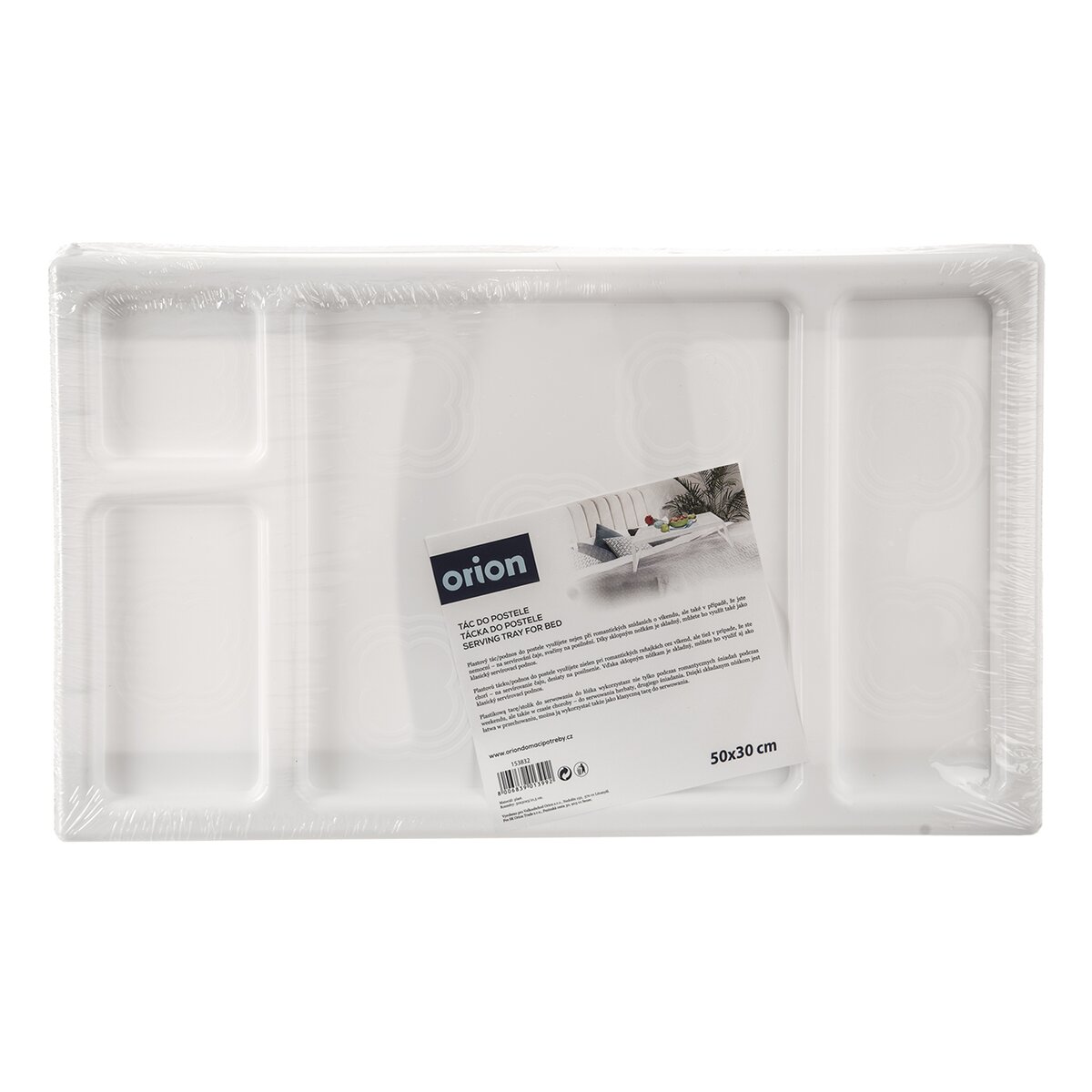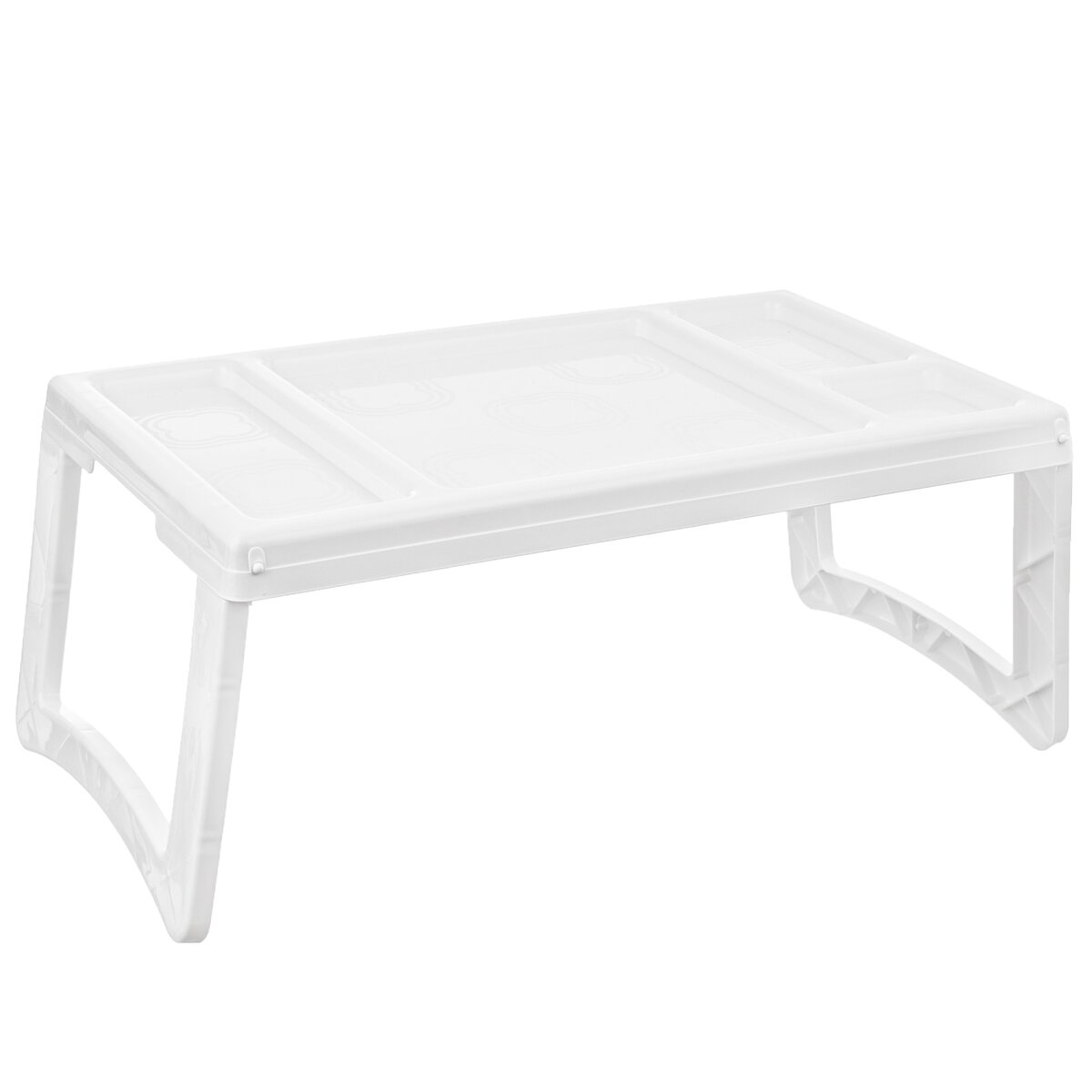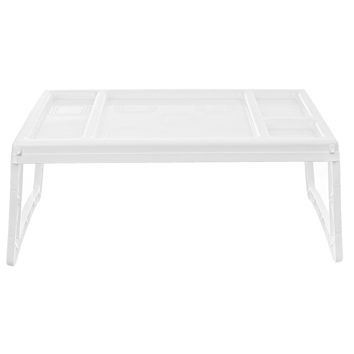 Kód produktu 153832Bílý plastový podnos do postele rozměru 50x30 cm se sklopnými nožkami a několika sektory, kam lze uložit odděleně pokrm, nápoje a jiné drobnosti.