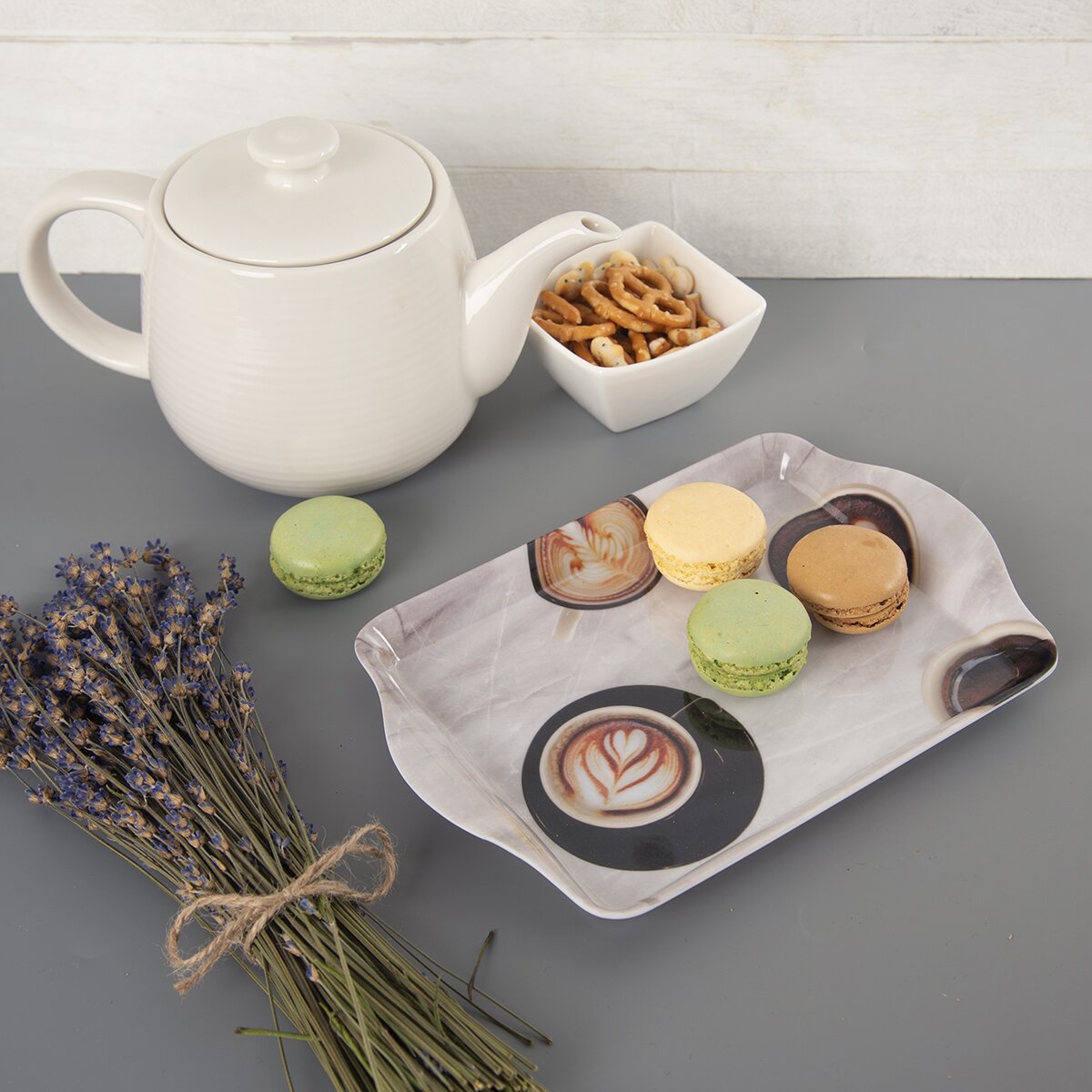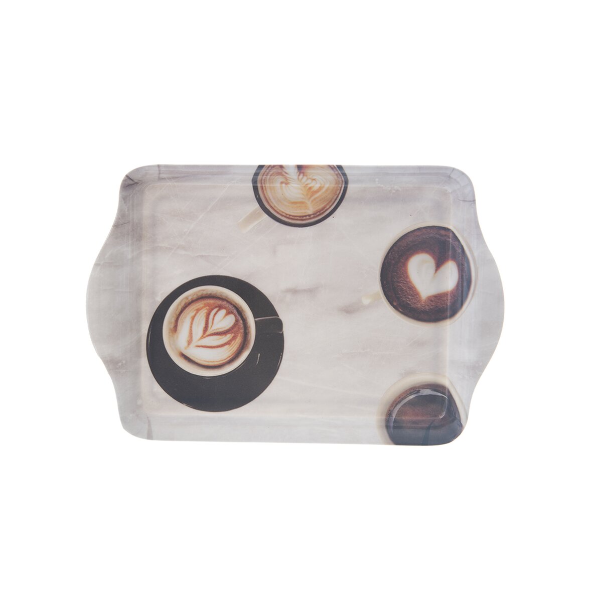 Kód produktu 153864Melaminový obdélníkový tác o rozměrech 21,5x14,5x2 cm s držadly a tlumeným dekorem s motivy kávy.