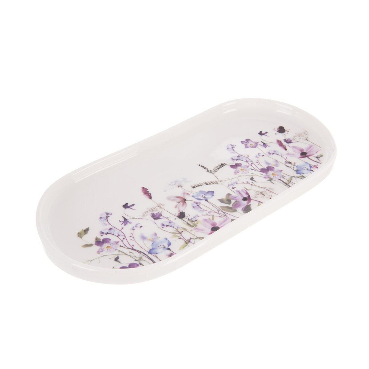 Kód produktu 153899Servírovací porcelánový tác LOUKA oválného tvaru má délku 25 cm a je zdoben něžným dekorem lučních květin.