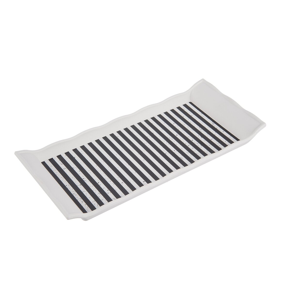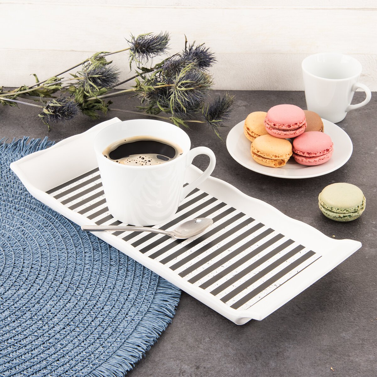 Servírovací tác je šikovným pomocníkem k přenášení, podávání kávy, čaje nebo drobného občerstvení. Snadno díky jeho zvednutým bokům, které jsou navíc ze spodní části opatřeny drobnými vroubky, přenesete dva hrnečky s cappuccinem nebo limonádu. Dekor černobílých pruhů zaujme nejen milovníky těchto barev v interiéru.