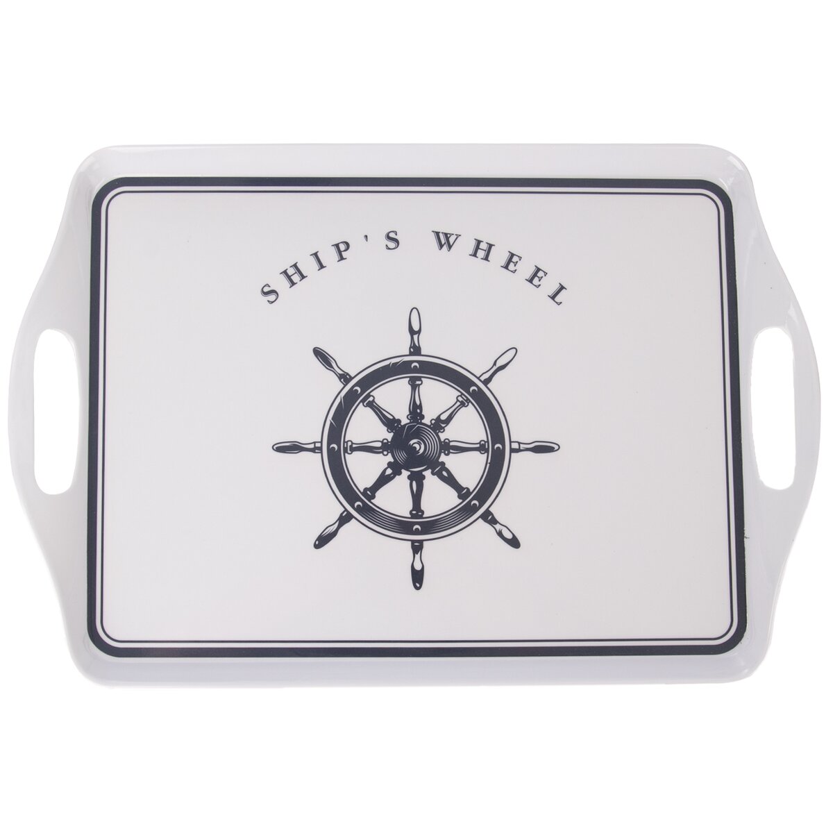 Kód produktu 153822Bílý melaminový obdélníkový tác SEA o rozměrech 38x23x2,5 cm s uchy a modrým dekorem s námořnickými motivy.