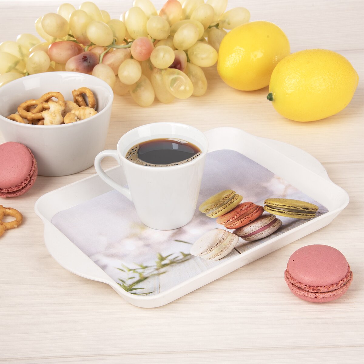 Malý obdélníkový tác s hezkým dekorem makronek využijete při servírování nejrůznějších dobrot a nápojů, např. malé kávy i sušenek nebo bábovky na dezertním talířku. Je vyrobený z kvalitního plastu PP, snese teploty až +40 °C.