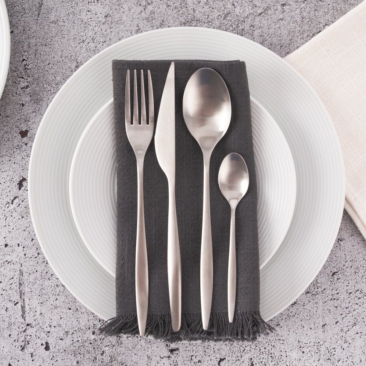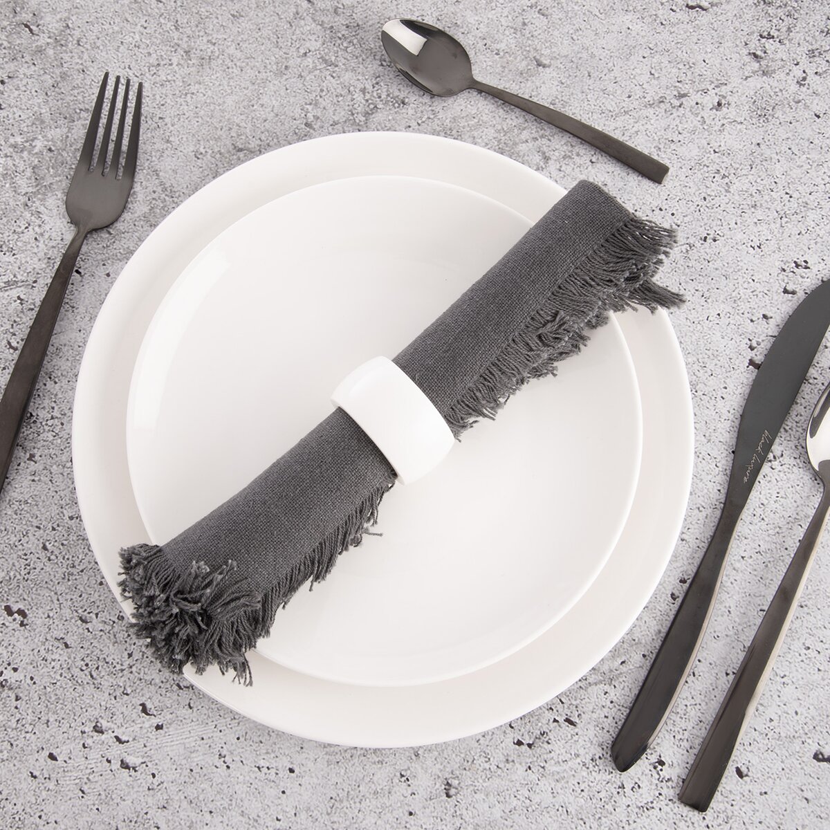 Tyto látkové ubrousky v nadčasovém šedém odstínu se hodí pro běžné i slavnostní prostírání. Mají jemnou strukturu a lem s třásněmi, lze je složit pod příbory nebo použít kroužky na ubrousky a položit je na položené talíře.