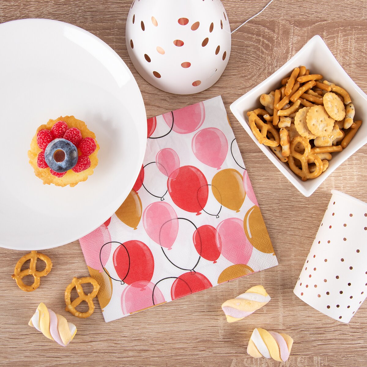 Hurá na party plnou hezky naservírovaných dobrot. Na rodinné i dětské oslavě jsou k utření úst a rukou potřeba ubrousky, které ke stolování také patří. Tyto zdobí motiv nafouknutých balónků, který se hodí k na zahradní party nebo oslavu jubilea.