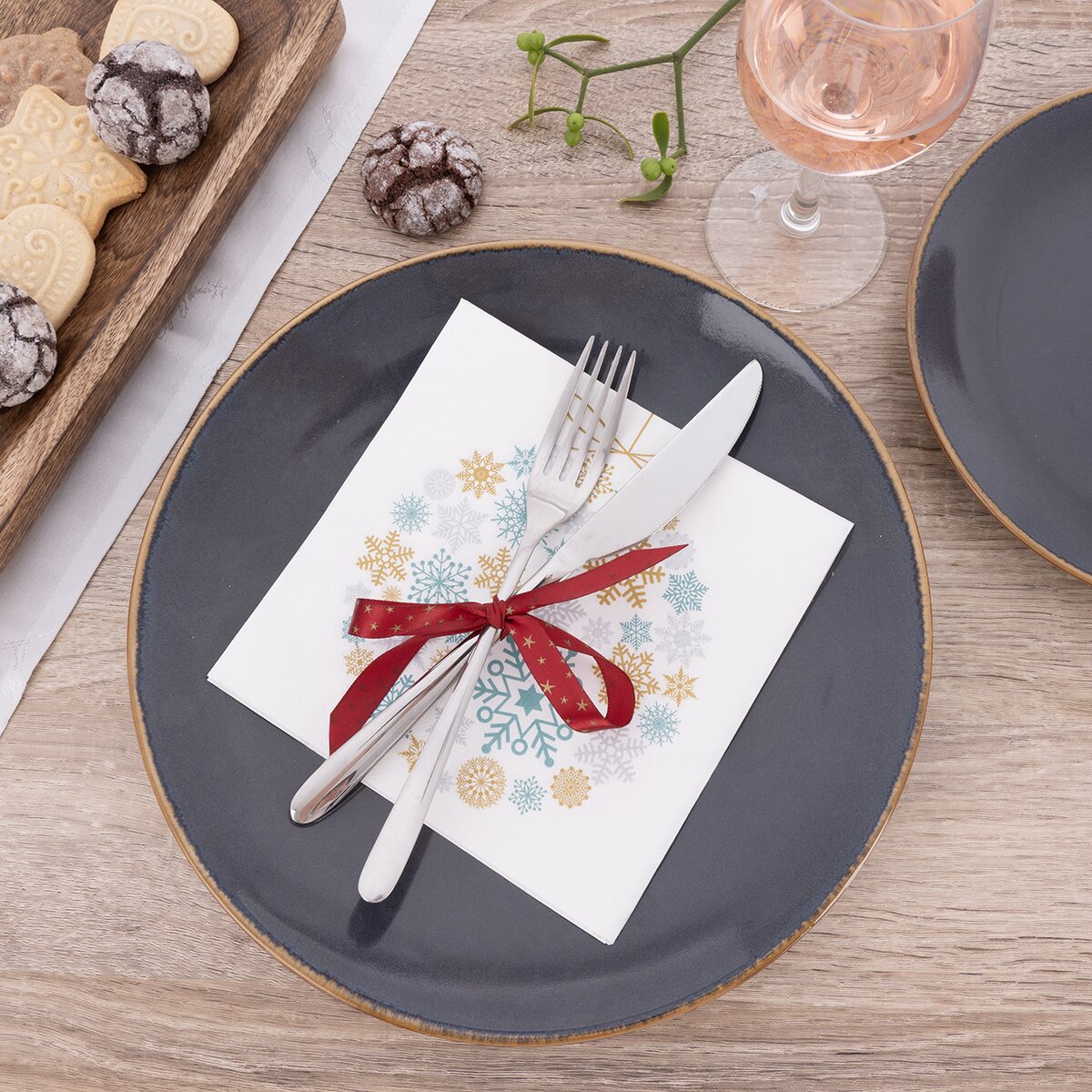 Ubrousky lze složit do nejrůznějších tvarů, stáhnout je ubrouskovou sponou nebo je jednoduše vložit pod příbory. Skvěle se hodí na vánoční večírek s rautem nebo firemní oslavu ke konci roku.