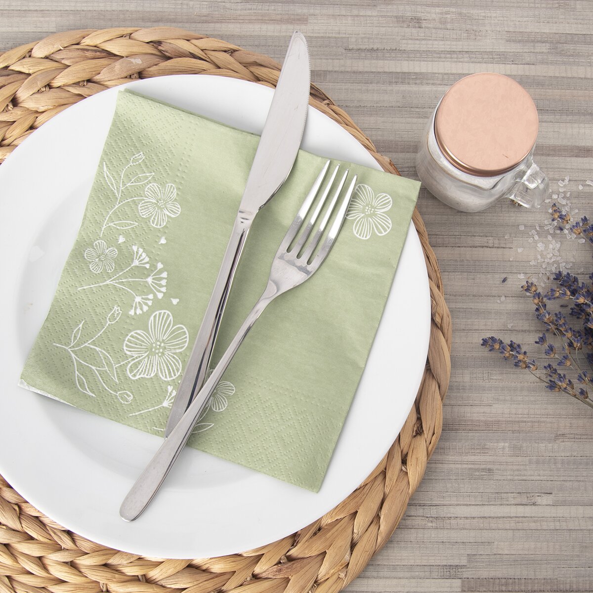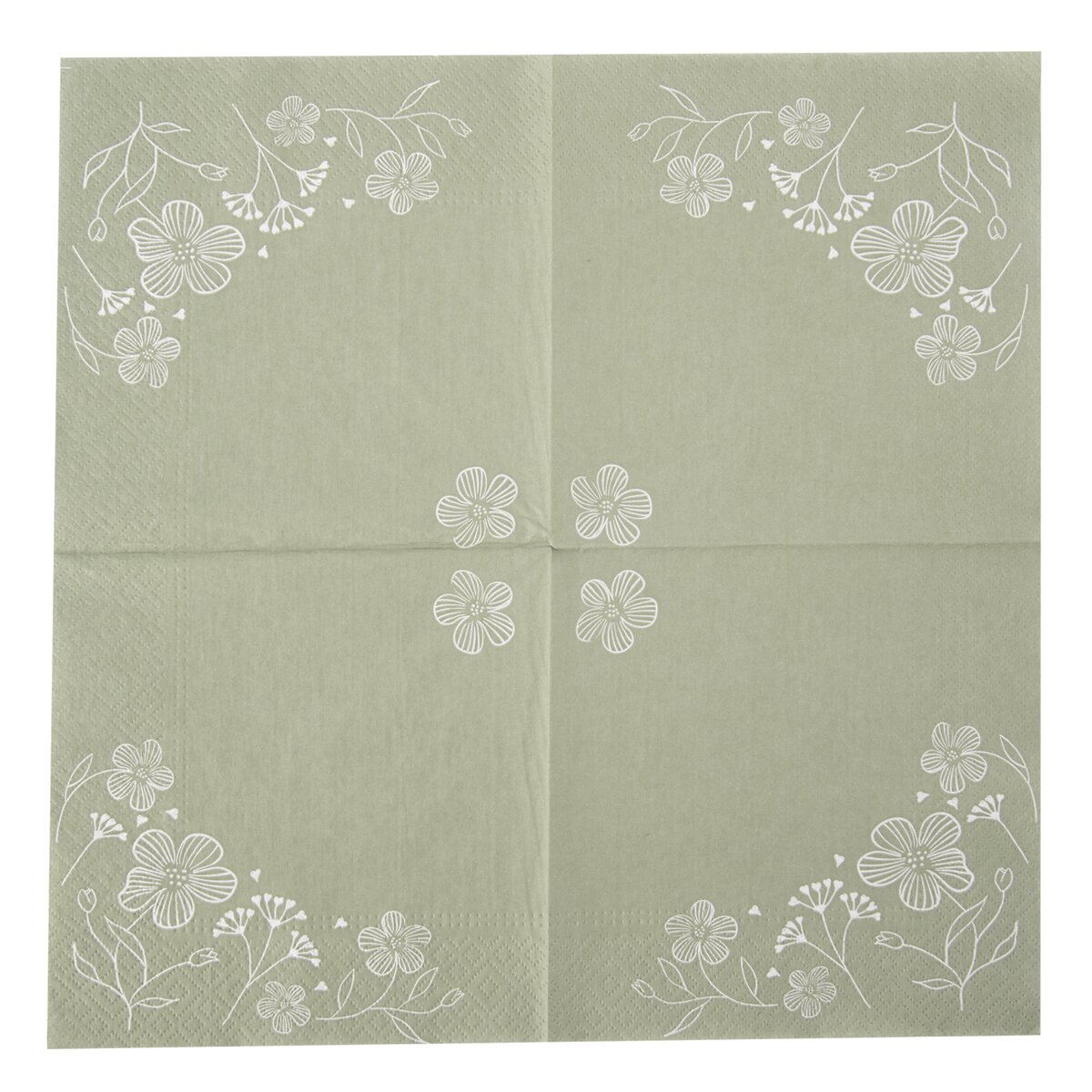 Decentní ubrousky v tlumeném zeleném odstínu jsou zdobeny jemným květinovým dekorem. Ten vznikl v dílně Orion designéru.