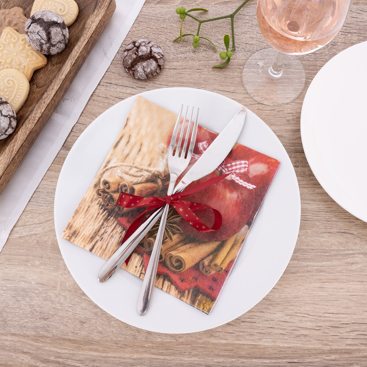 Kód produktu 842372Sada 20 ks papírových ubrousků je zdobena vánočním motivem s jablíčkem a skořicí. Ubrousky mají velikost 33x33 cm a doplní prostřený stůl o vánočních svátcích i v období Adventu.