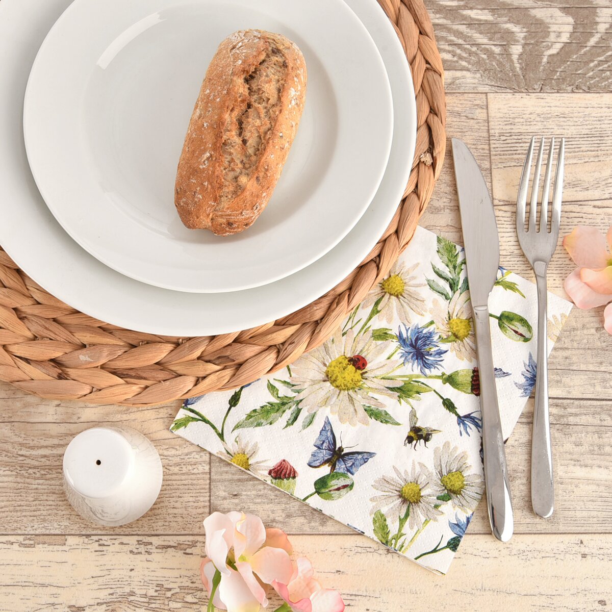 Kód produktu 842311Sada 20 ks květinových papírových ubrousků s motivem chrp a motýlů, o velikosti 33x33 cm, doplní prostřený stůl i mísu s jarními dekoracemi.