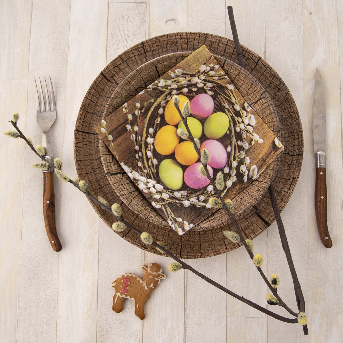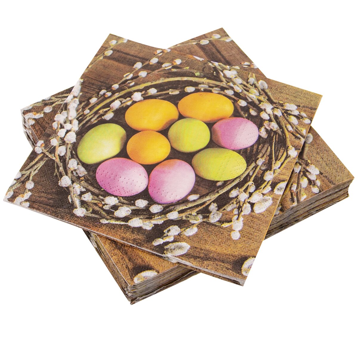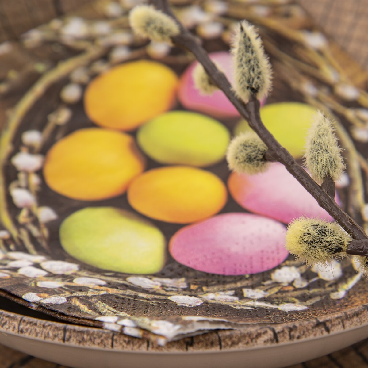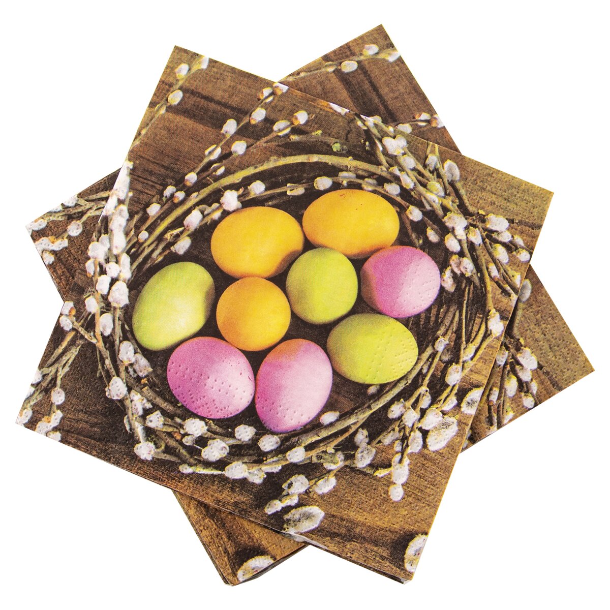 Kód produktu 841880Sada 20 ks velikonočně laděných papírových ubrousků s motivem vajíček v hnízdě, velikosti 33x33 cm, doplní prostřený stůl i košík s kraslicemi.