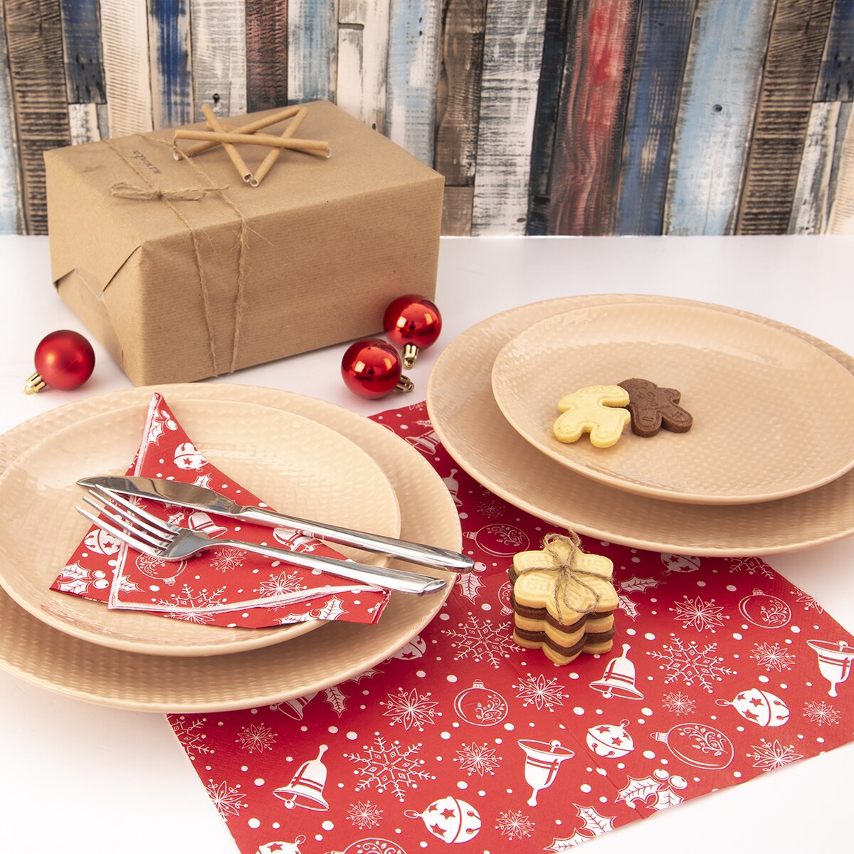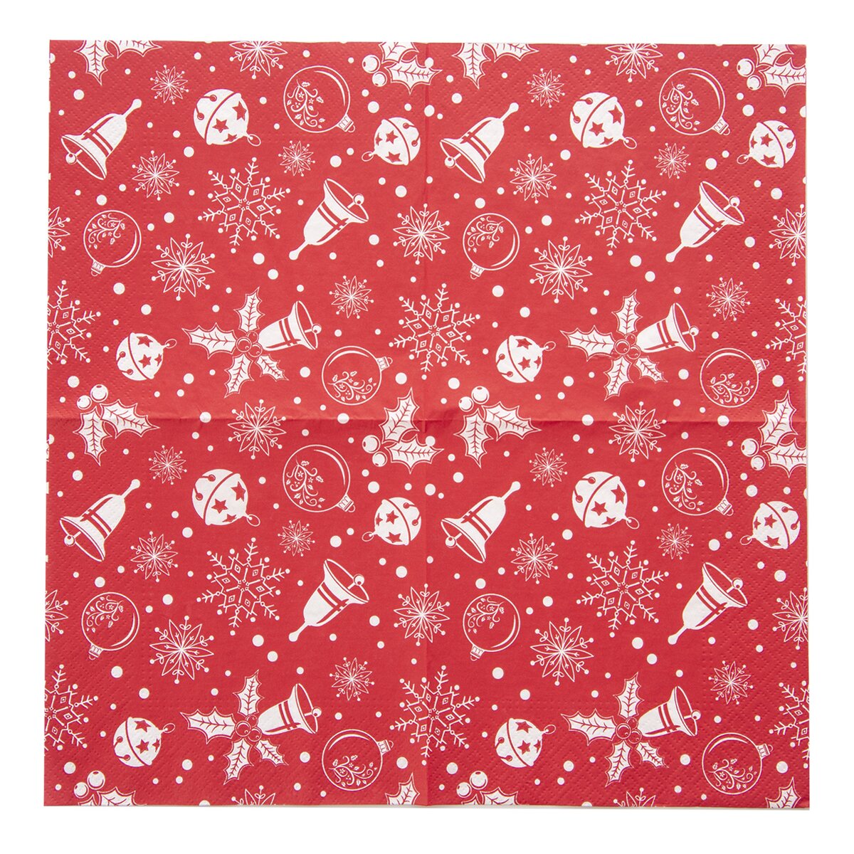 Kód produktu 842307Sada 20 ks červených papírových ubrousků s motivem vloček, rohliček a zvonků, o velikosti 33x33 cm, doplní prostřený stůl o vánočních svátcích i v období Adventu.
