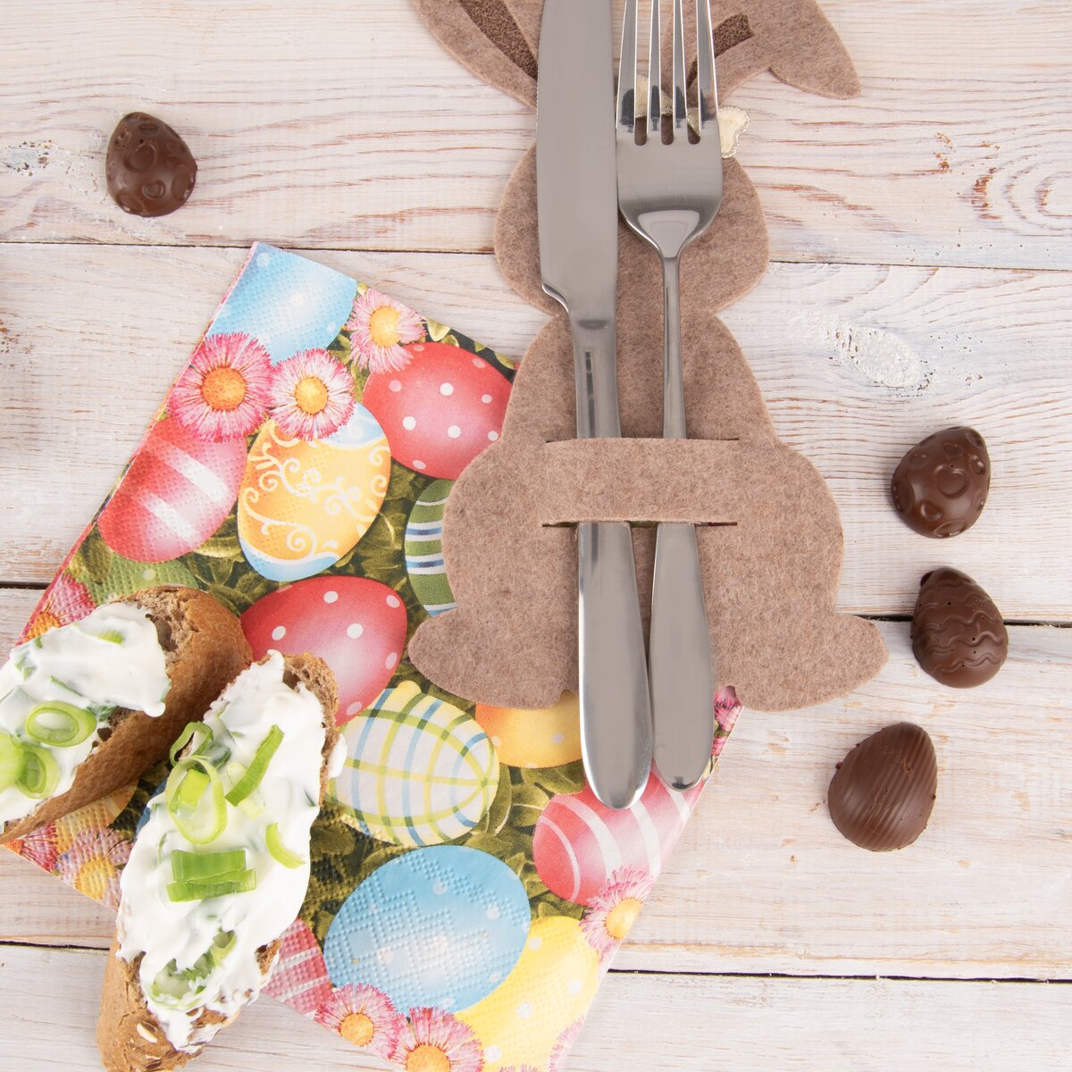 Tu pravou tečku u prostřeného stolu dodá velikonočně laděný papírový ubrousek. Ať už si dáte práci a složíte jej, nebo ho jednoduše položíte pod připravené příbory. I mísa s originálními barevnými kraslicemi bude ještě hezčí, když je podložíte ubrouskem s velikonočním motivem.