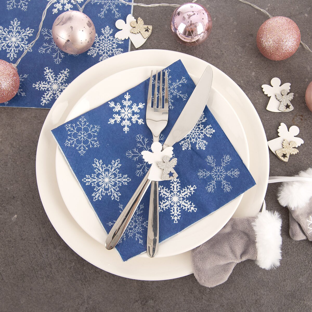Tato sada 20 kusů třívrstvých modrých ubrousků s decentním vánočním motivem podtrhne slavnostní stolování nejen o těchto svátcích.