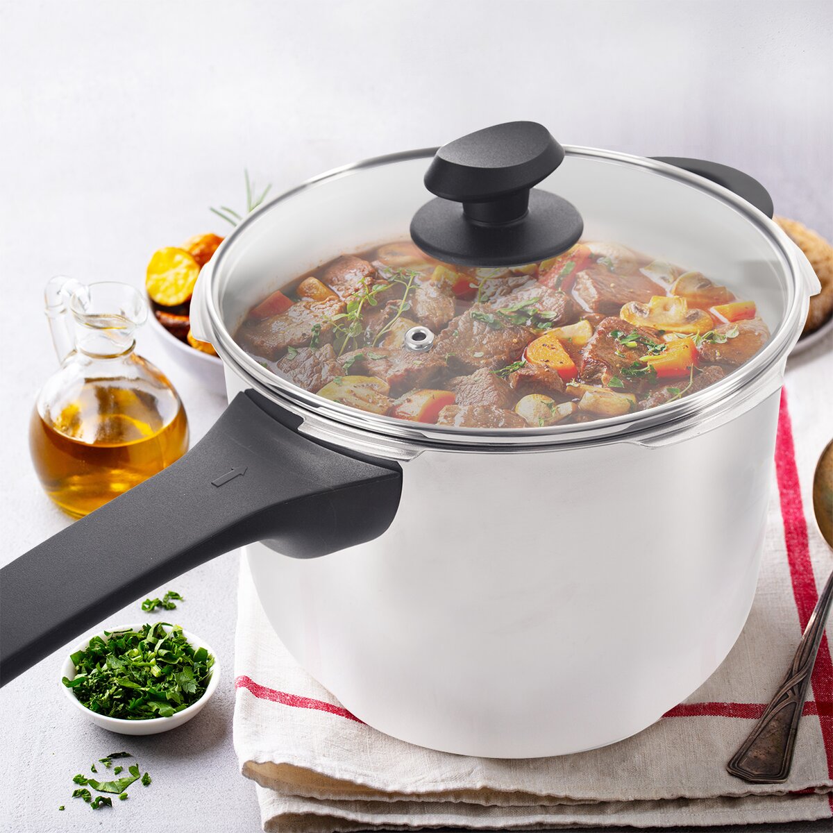 Pokud není mnoho času a oběd se blíží, leckdo rád sáhne po tlakovém hrnci. Zvlášť v případě přípravy vývaru z kostí nebo hovězího na guláš. A po změknutí pod tlakem je třeba pokrm dovařit. K tomu lze použít samostatnou skleněnou poklici s nerezovým lemem a pevným plastovým úchytem. Ta ušetří energii i čas při vaření, po zahuštění omáčky, prováření polévkových nudlí apod. Je opatřena otvorem pro únik přebytečné páry.