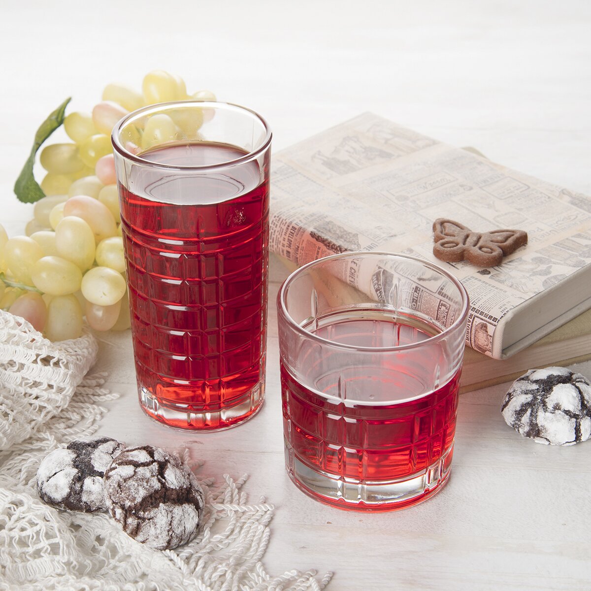 Křížení svislých a vodorovných čar zdobí reliéf na těchto sklenicích, určených k univerzálnímu použítí. Jejich dekor odkazuje k tradici masivného skla s výrazným výbrusem, které se často používá nejen v hotelových lobby barech, např. k podávání whisky s ledem.