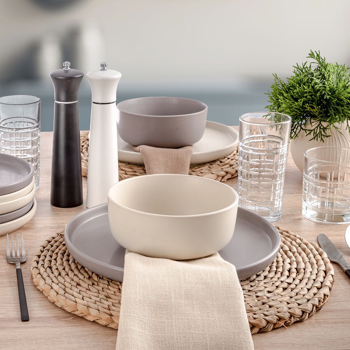 Křížení svislých a vodorovných čar zdobí reliéf na těchto sklenicích, určených k univerzálnímu použítí. Jejich dekor odkazuje k tradici masivného skla s výrazným výbrusem, které lze najít nejen v hotelových lobby barech.