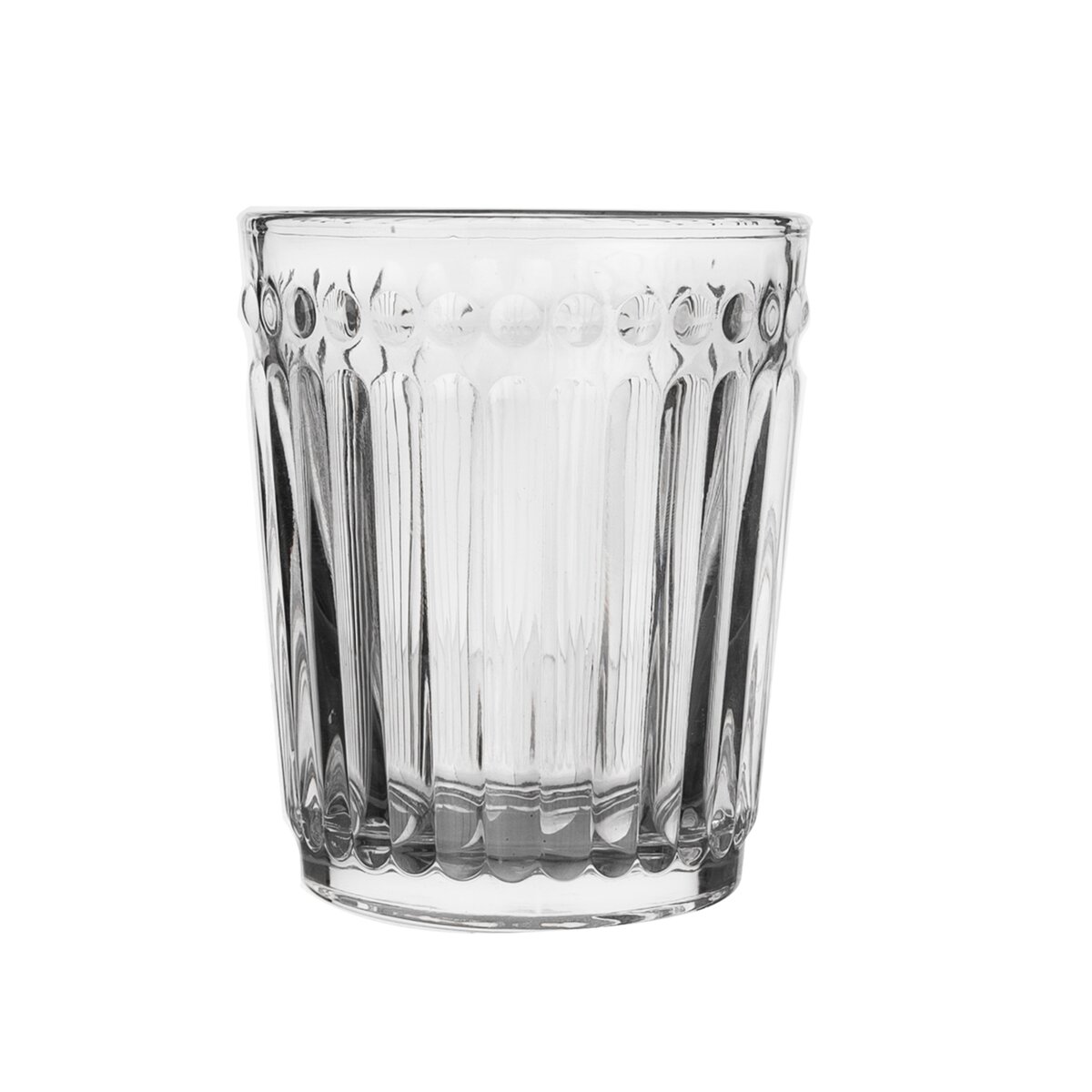 Kód produktu 127296Sklenice s plastickým vzorem. Materiál: sklo. Rozměry: objem 0,32 l, pr. 8 cm, v. 10 cm.