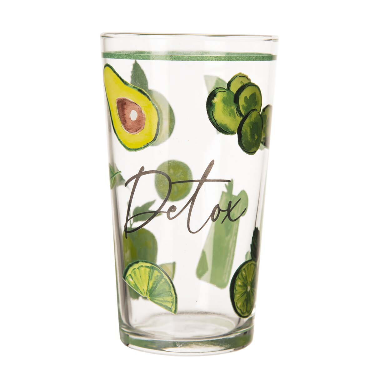 Kód produktu 129316Sklenice o objemu 0,6 l s barevným dekorem zelených jablek, kiwi, avokáda a okurků, vhodná nejen na letní nápoje a minerálky.