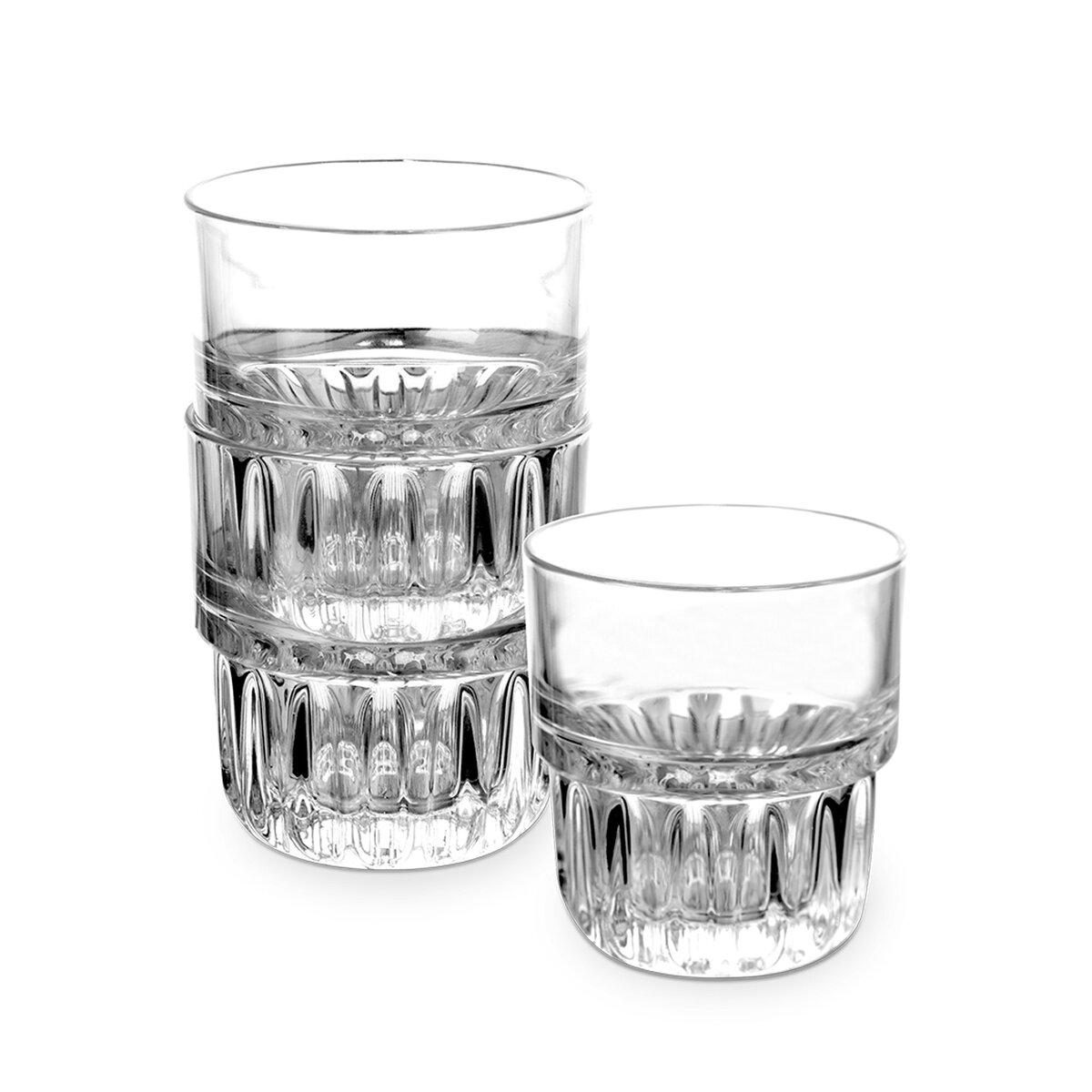 Zajímavá stohovatelná sklenice se svislým oblým vzorem z vnější strany je určena k podávání vody, nealko nápojů i míchaných drinků.