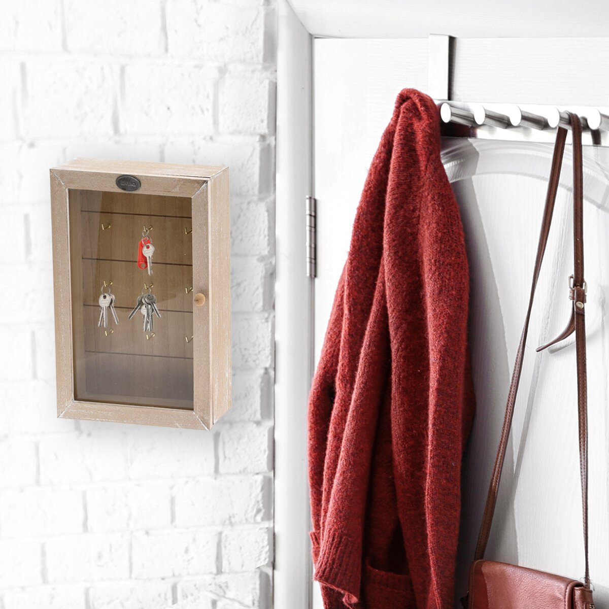 Stylová skříňka z lisovaného dřeva, opatřená povrchovou úpravou, je určená k ukládání klíčů a jiných drobností. Uvnitř je 9 háčků na klíče, takže už nebudete marně hledat klíče od sklepa, chalupy, dílny nebo skříňky ve škole či v práci.