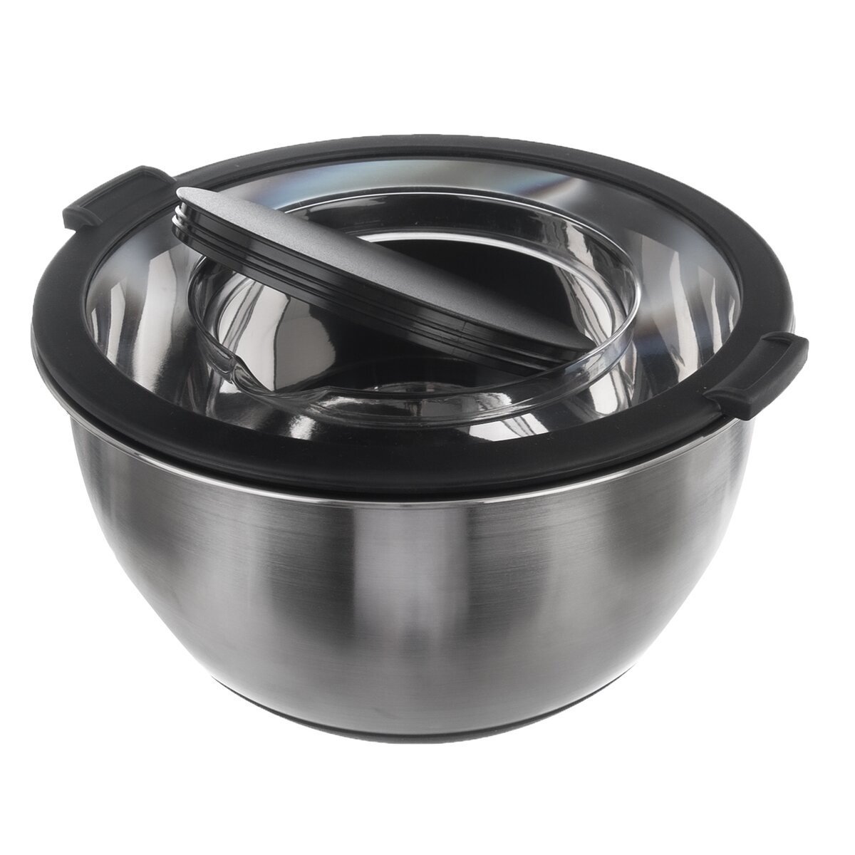 Kód produktu 120293Kvalitní kulatá nerezová mísa objemu 3 l, s průhledným plastovým víčkem a s oddělávacím středem, které usnadní šlehání, zamezí stříkání těsta. Má praktické protiskluzové silikonové dno.