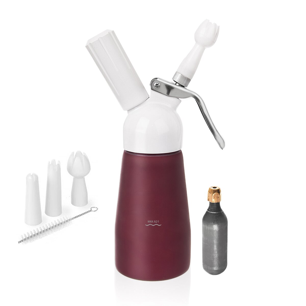 Tato velikost je vhodná pro výrobu a podávání šlehačky o objemu 0,1 l - 0,2 l. Navíc je v sadě i balení 10 kusů výměnných bombiček. Šlehačkové bombičky s náplní cca 8 g N2O (potravinářský oxid dusný E942) stačí vložit do matice láhve a našroubovat je na tělo dle návodu konkrétní láhve. Jedna bombička našlehá cca 0,5 litru smetany.