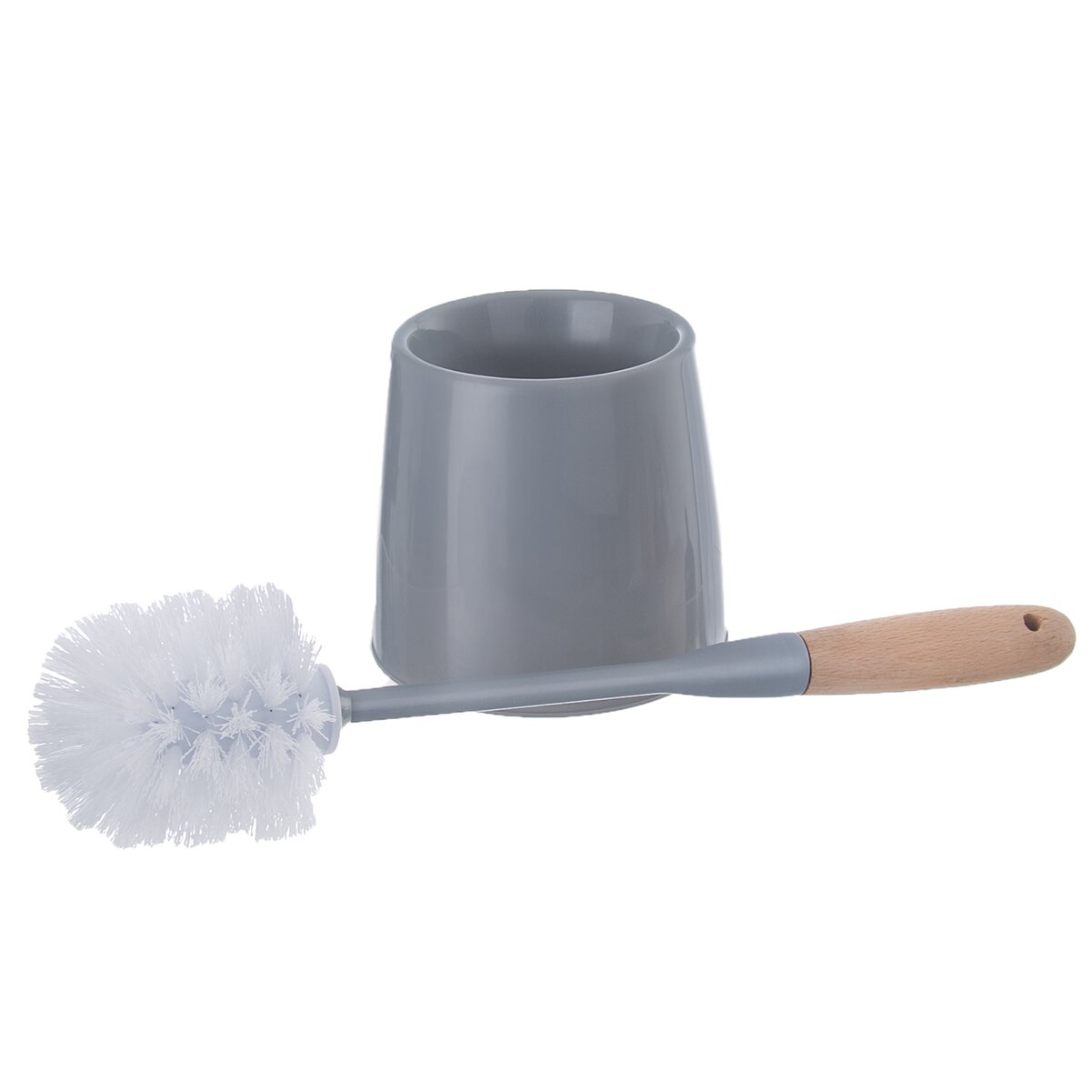 Kód produktu 540657Souprava na WC s nádobkou a štětkou výšky 40 cm, kombinující šedý plast a bambusové dřevo, je určená k pohodlnému čištění toalety.