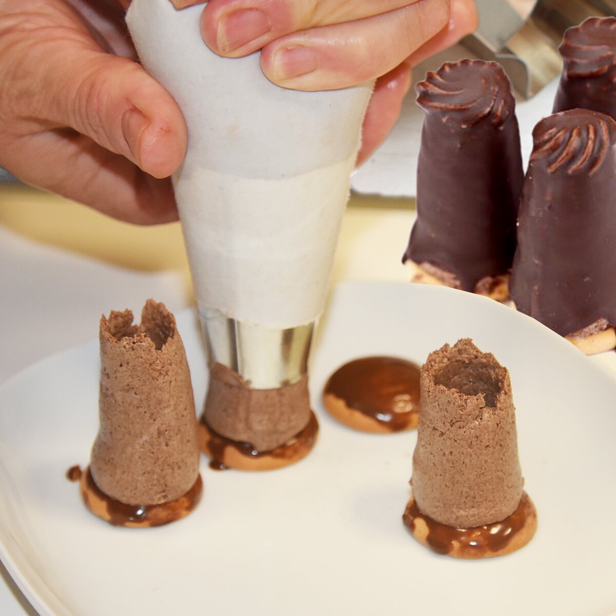 Pomocí této speciální dvoustěnné špičky můžete vytvořit tento oblíbený zákusek, stačí do sáčku vložit špičku, krém a na připravený cukrářský piškot tahem vzhůru nanést. Vzniklý otvor se pak plní vaječným likérem, uzavře krémem a máčí se v čokoládě.