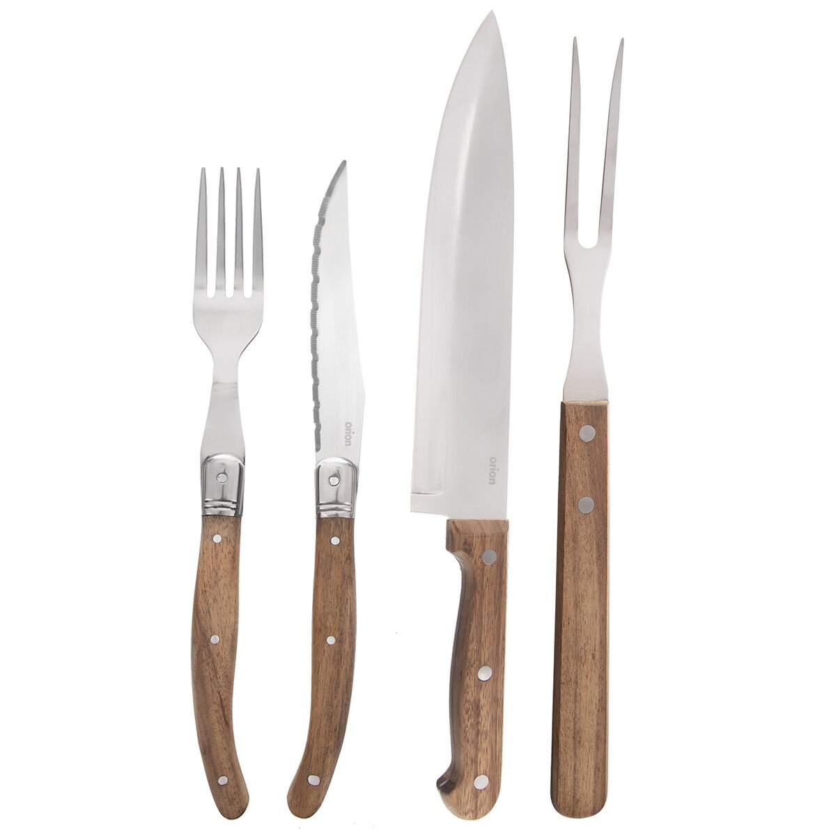 Kód produktu 154206Sada nožů, vidliček, vidlice a nože s čepelí z nerezové oceli s akáciovými rukojeťmi a prkénka s drážkou z akáciového dřeva, uložených v dárkové krabici. Hodí se k přípravě steaků, krájení masa, zeleniny k pečení či grilování, ale bude i hodnotným dárkem.