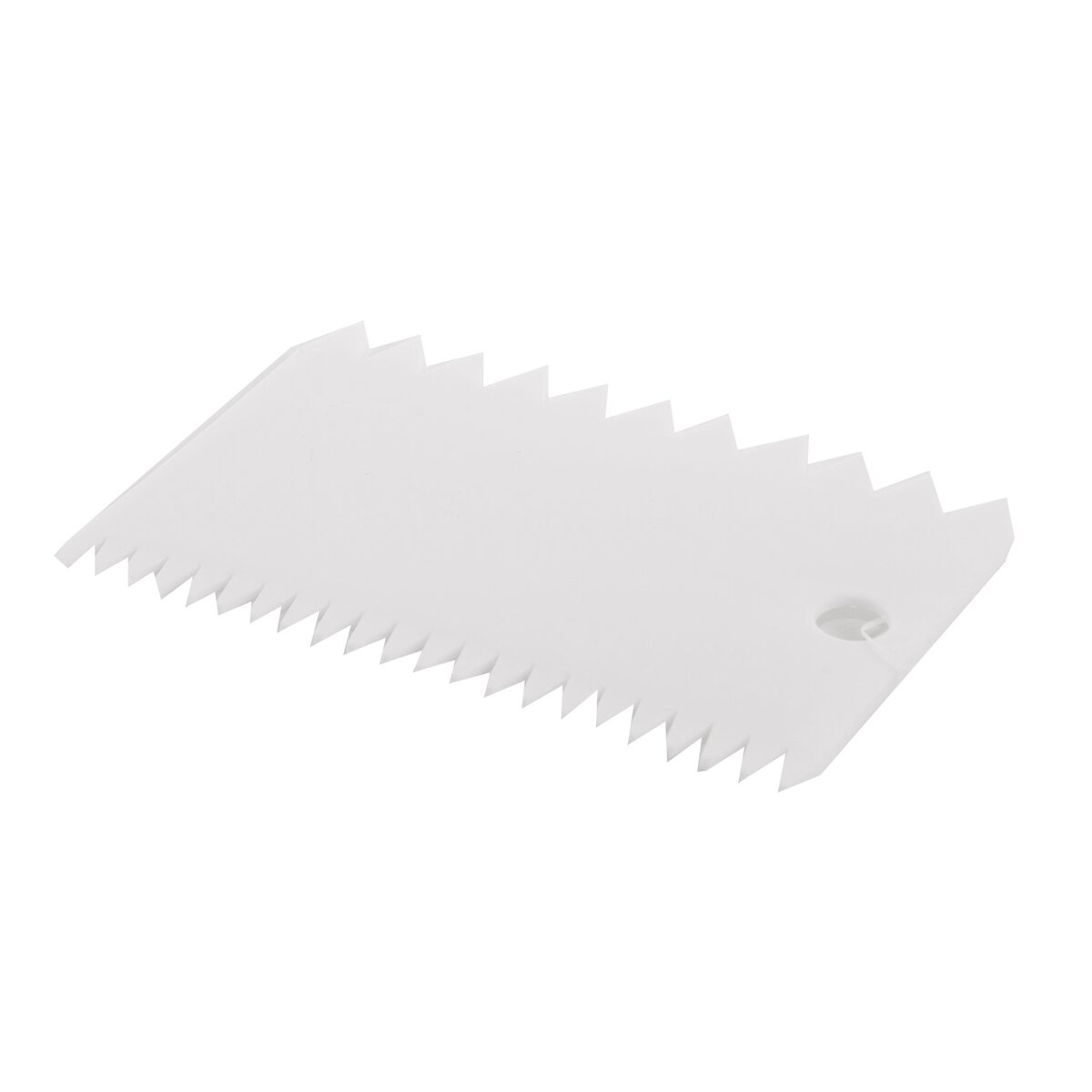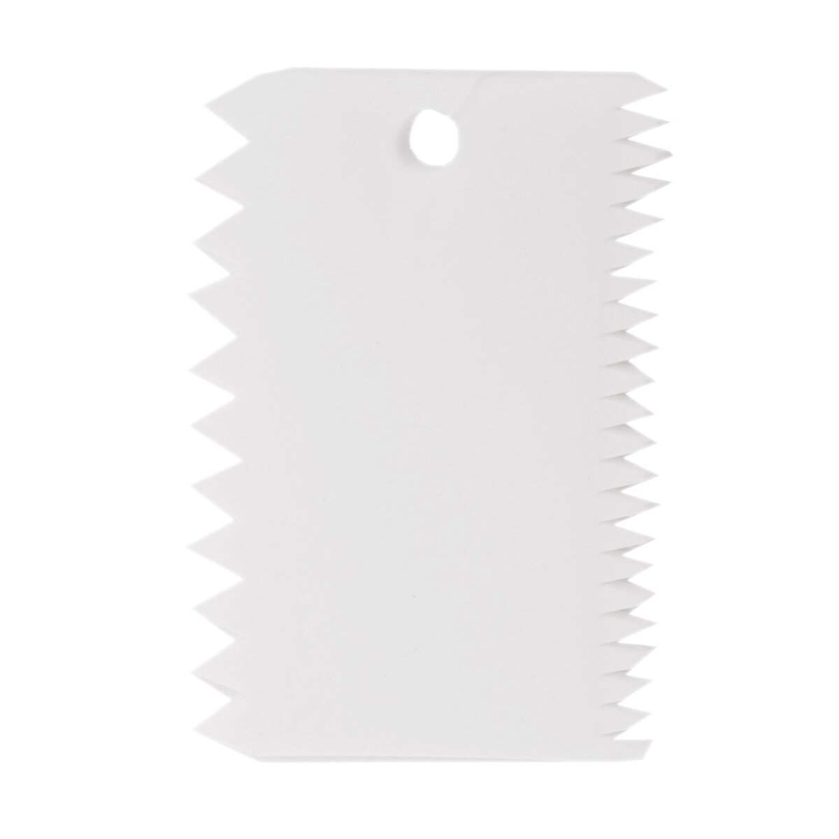 Kód produktu 142831Obdélníková plastová stěrka velikosti 11x7,5 cm s dvěma typy zubatých okrajů, vhodná pro zdobení krémů, polev nebo čokolády na koláčích i dortech.