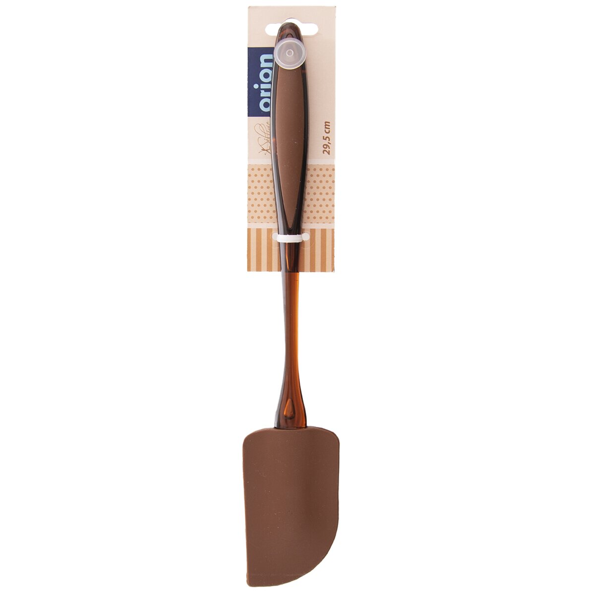Kód produktu 142835Pružná hnědá silikonová stěrka s plastovou rukojetí celkové délky 29,5 cm umožní přípravu, roztírání těsta, krémů i polev.