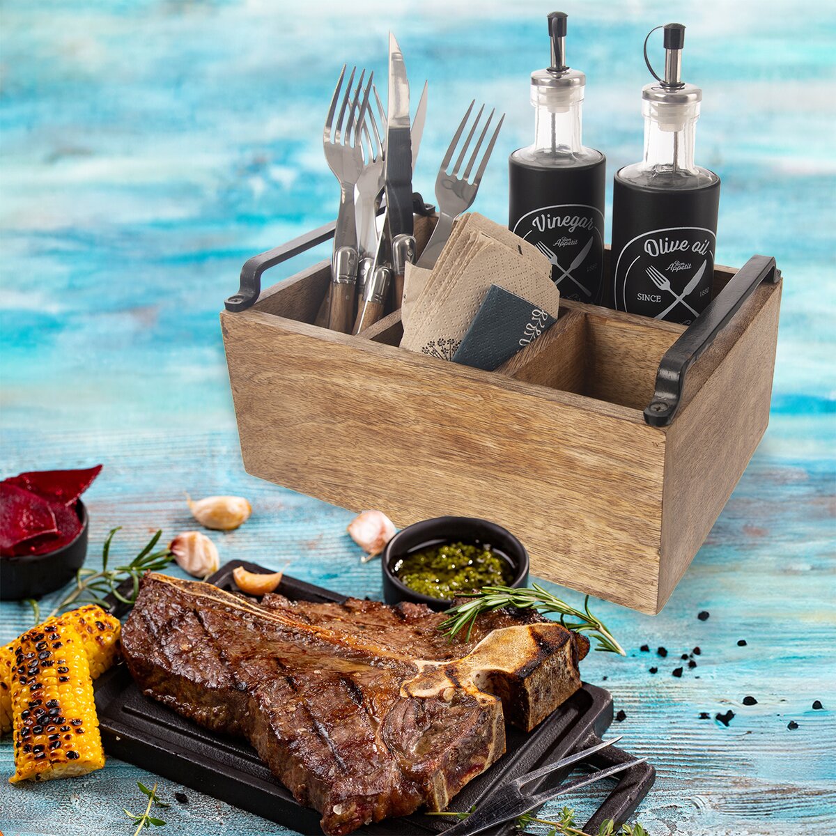 Kód produktu 154304Stojan na dochucovadla z mangového dřeva s kovovými úchyty. Je rozdělen na 4 sekce, kam lze vložit dochucovadla, příbory, kořenky i ubrousky.