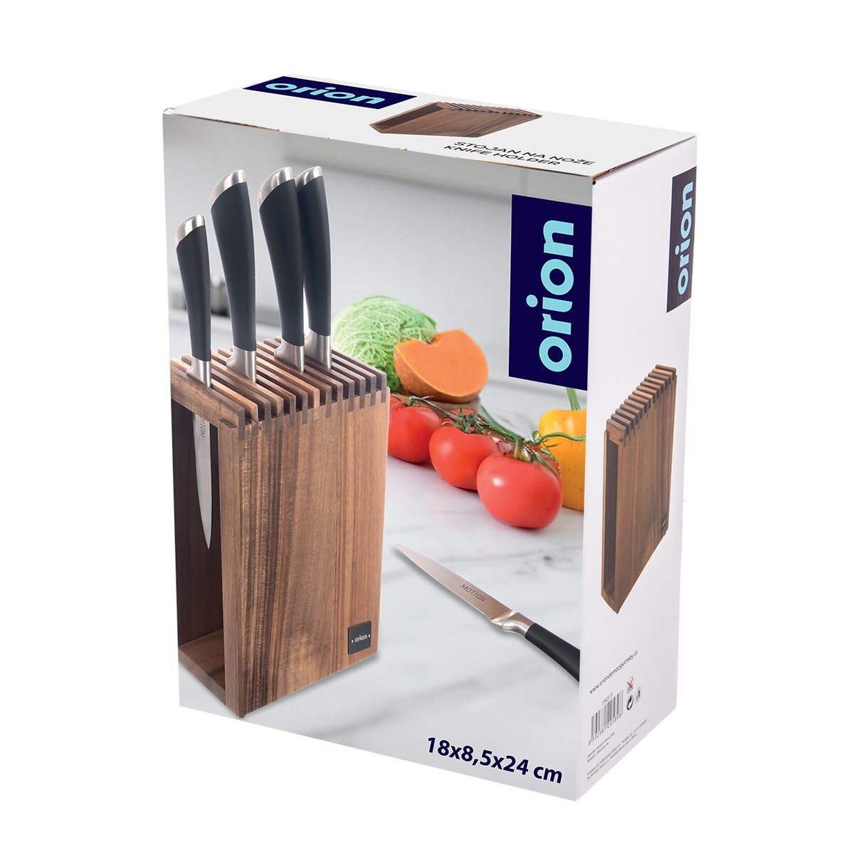 Praktickým řešením k uložení ostrých kuchyňských nožů je stojan na nože. V tomto stabilním stojanu z ořechového dřeva lze uložit nože, ať už jde o malé nože na zeleninu nebo velké santoku nože se širším ostřím. Každý nůž stačí vsunout do drážky v horní části, takže se nebudou o sebe třít, nedojde k tupení a poškození ostří.